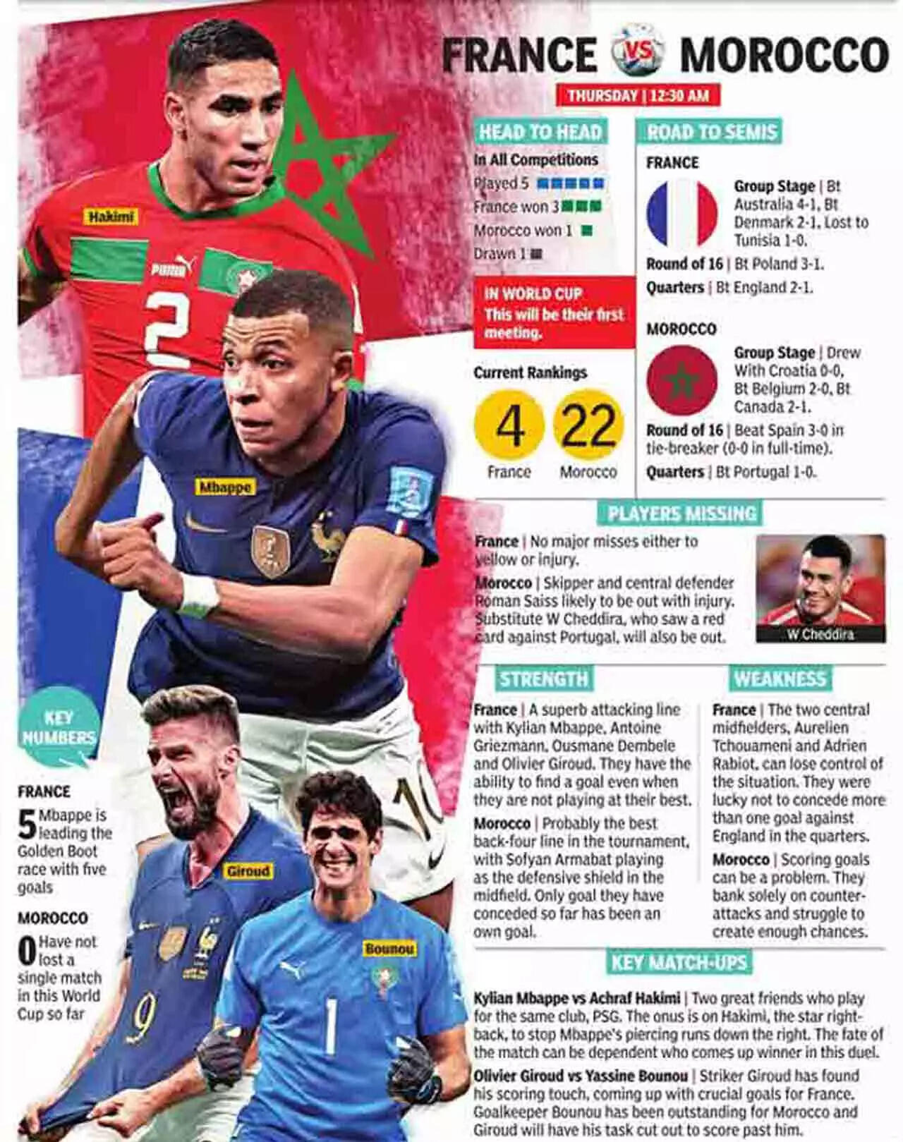 In Mbappe France have possibly the one player on the planet, who always looks like he can score. He was of course brilliantly marked by Kyle Walker and others in the quarter-final against England and didn't get on the scoresheet, but the Moroccans might find it far more difficult to stop Mbappe than the English did.