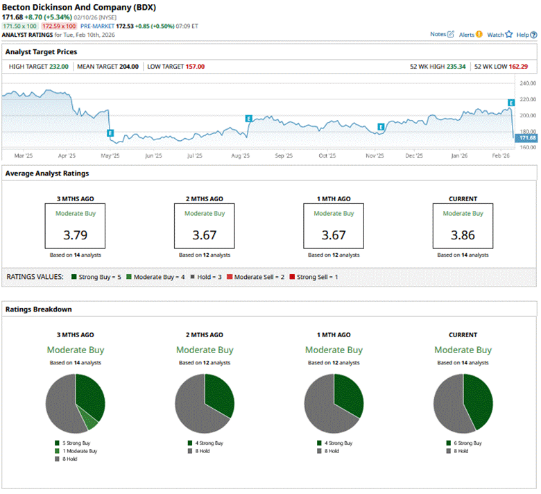 On Feb. 9, BDX shares fell 1.3% following the release of its Q4 2025 earnings. The company’s revenue increased 1.6% year-over-year to $5.3 billion and surpassed consensus estimates. Additionally, its adjusted EPS amounted to $2.91, also beating Street’s estimates by 3.2%. However, the decline was primarily due to its life sciences revenue of $766 million falling well below the consensus estimate of $1.3 billion.