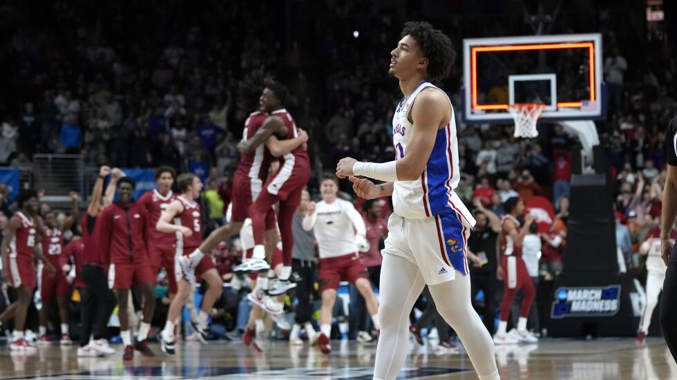 DES MOINES, Iowa — Kansas’ national title defense ended in the second round of NCAA Tournament on Saturday when Arkansas’ Ricky Council IV made five free throws in the closing seconds and the eighth-seeded Razorbacks beat the No. 1 seed Jayhawks 72-71.