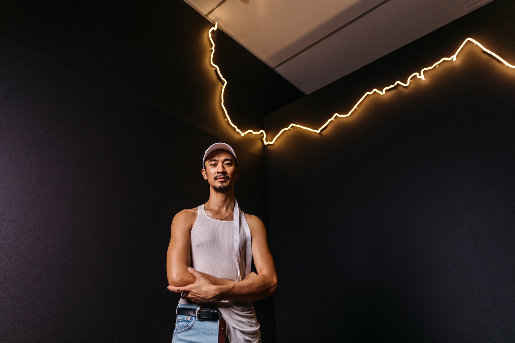 The orange light cast by the chandelier evokes the street lights that he remembers as a "cue to run home" in the evenings; the iron-lace panels recall those on his grandmother's house in Eveleigh Street as well as those on the terrace front of the Settlement — a community hub where he and other children hung out in the 90s.