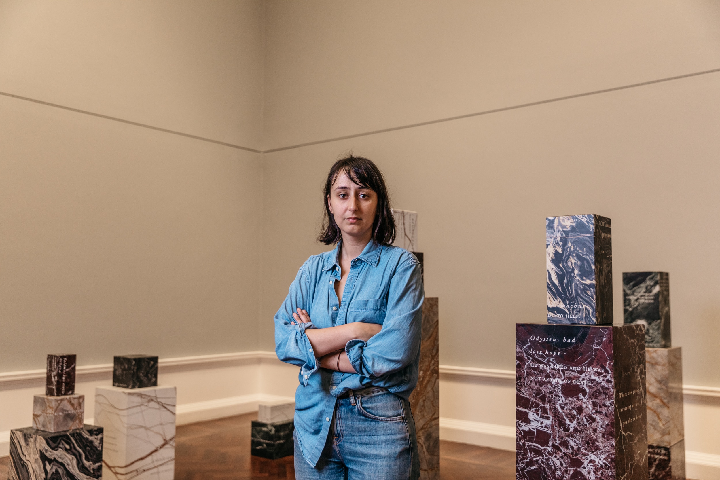 For the Biennial, she worked with a grave-maker to inscribe marble offcuts with lines from both the Odyssey and leaked cables detailing refugee experiences in Australia's offshore detention facilities in Manus and Nauru. The similarity in lines from these ostensibly disparate texts inspired her to 'prank' the audience: each line is falsely attributed to the alternate source.