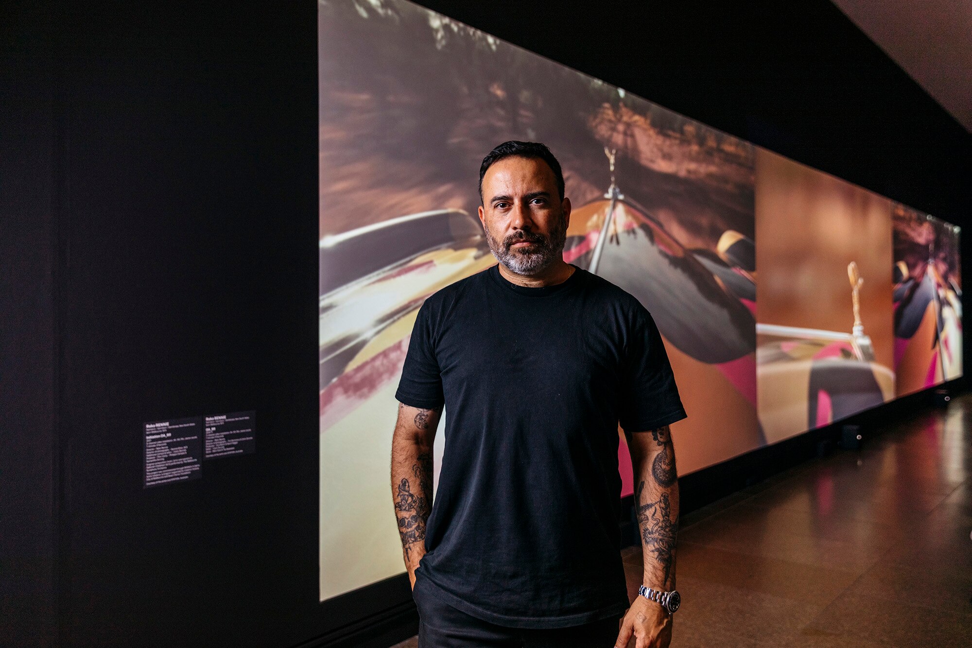 Naarm/Melbourne artist Reko Rennie's video works OA_RR (2016-17) and Initiation OA_RR (2021) take centre stage in the downstairs gallery of AGSA. In the first, he makes a return trip to ancestral Kamilaroi/Gamilaroi/Gamilaraay Country in a custom-painted Rolls Royce, to enact a contemporary ceremony of burn-out rings in the red dirt; in the second, he voyages through the dockside suburbs of Naarm/Melbourne's west in a hot-pink-metallic Monaro coupe, to enact a similar ritual on the bitumen.