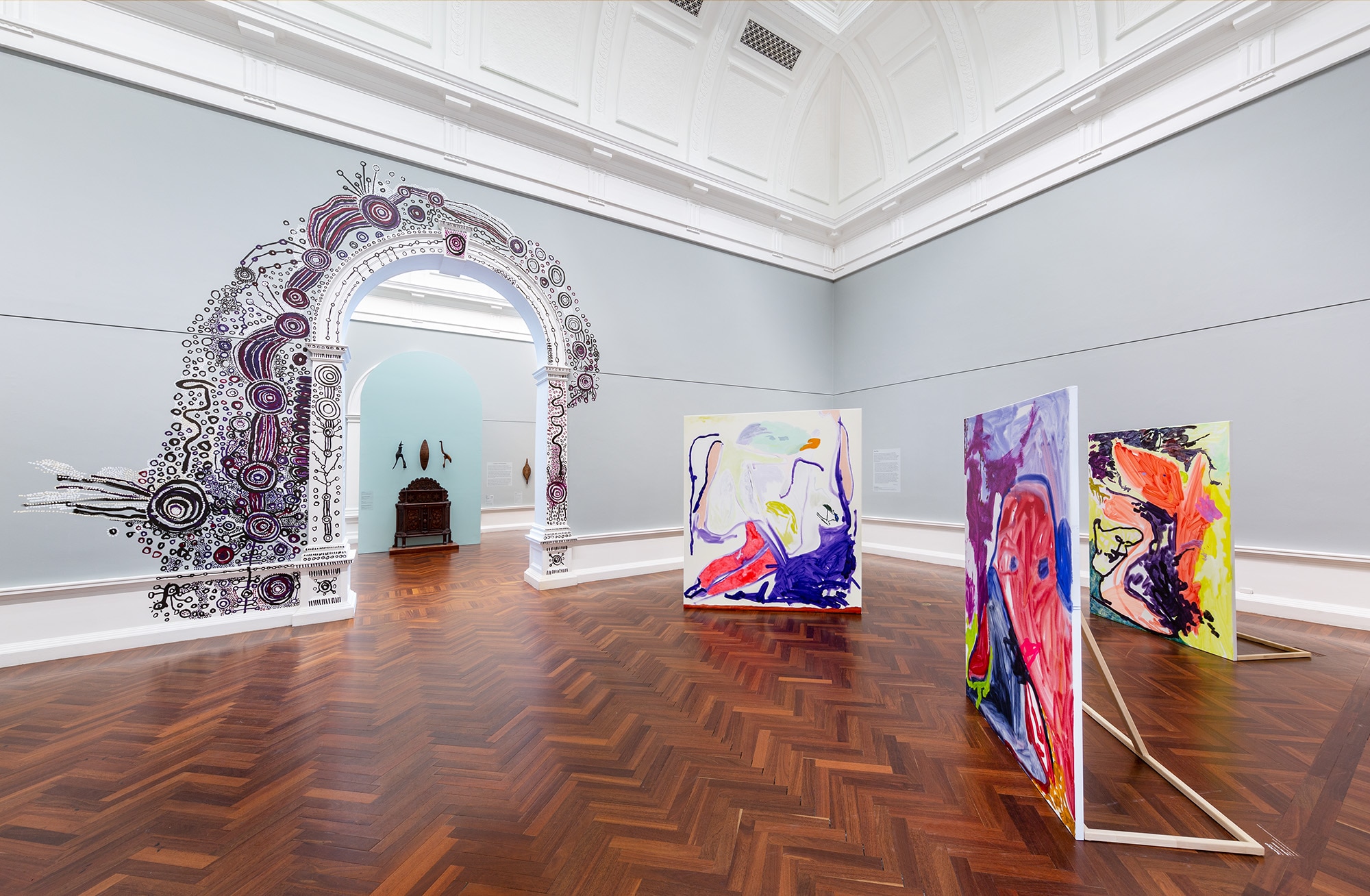 A series of large, bright, paintings by Warrang/Sydney artist Tom Polo greet viewers as they cross the threshold into the Elder Wing: they're not on the walls, but installed within the gallery space on support structures, so that they resemble 'theatre flats'.