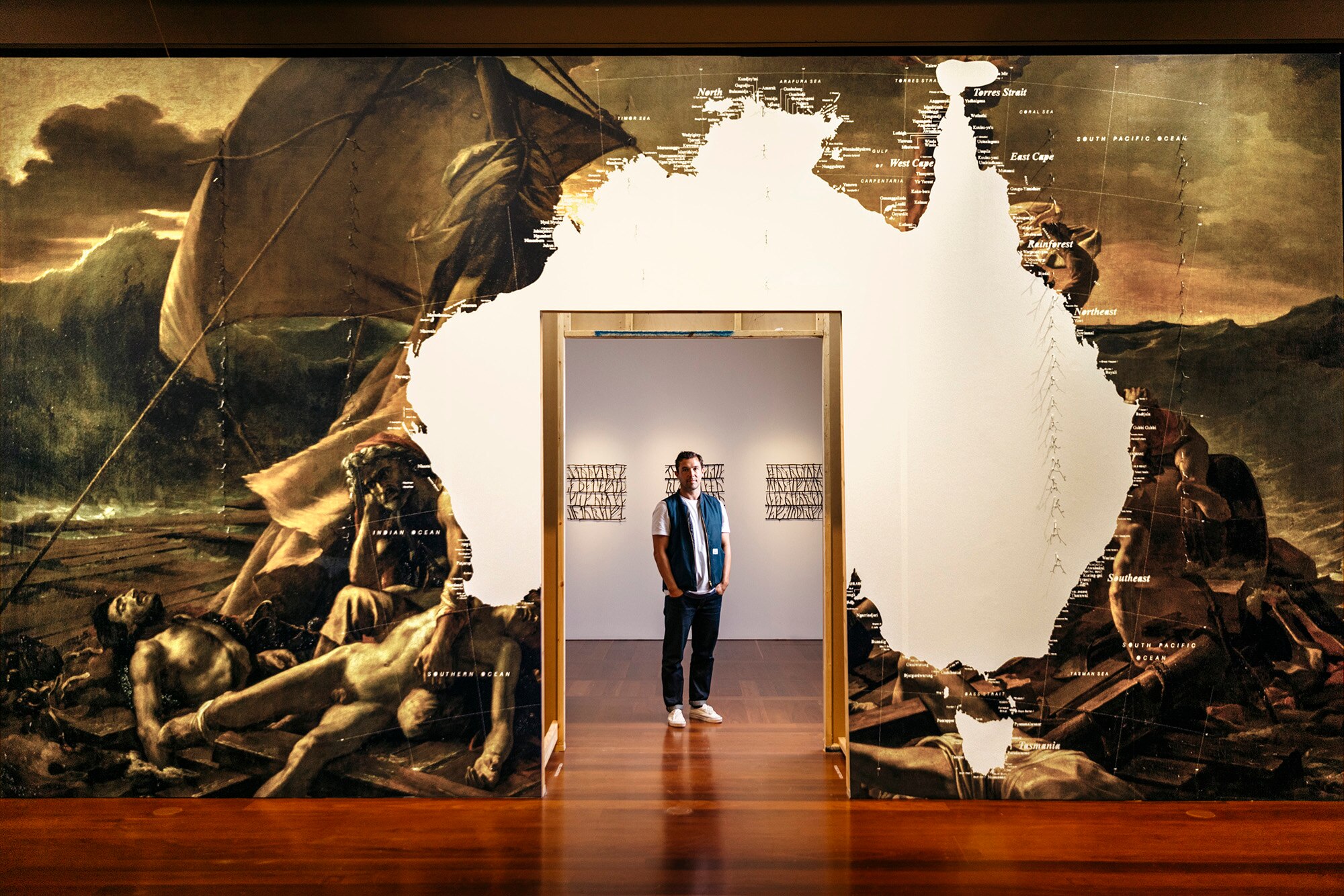 Over one wall is layered a large-scale reproduction of Théodore Géricault's epic 1819 painting The Raft of the Medusa (depicting a real-life colonial catastrophe of shipwreck and cannibalism on the slave route); and a version of the 1974 map of Australia devised by white anthropologist Norman Tindale, in which he demarcated the "Tribal Boundaries in Aboriginal Australia" — though in Cross's version, Tindale's boundaries have been erased.