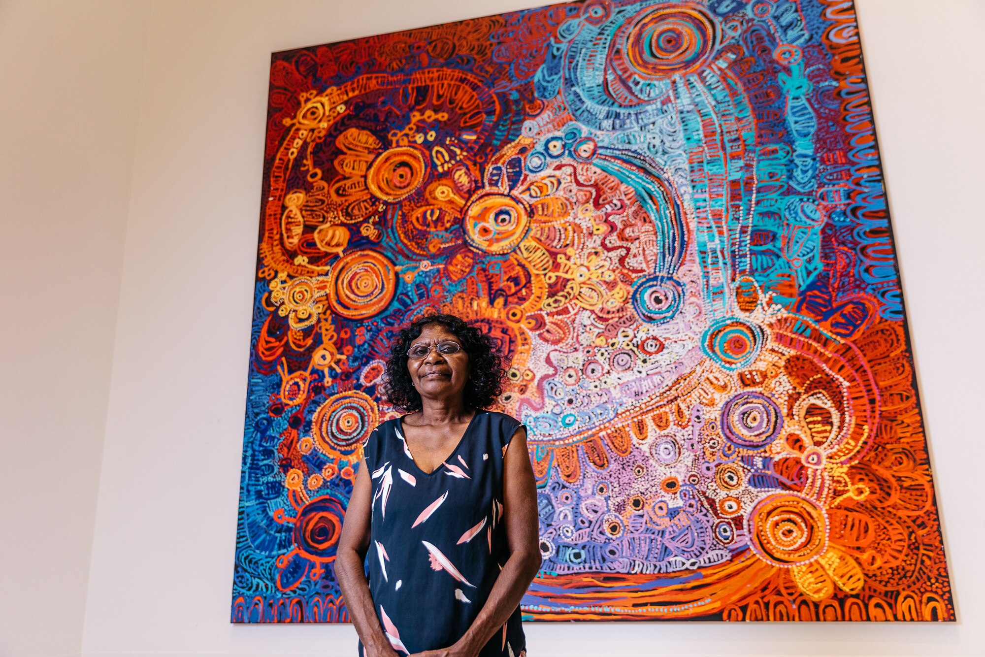 Nearby, Pitjantjatjara artist Rhoda Tjitayi has painted her grandmother's tjukurpa (story) directly onto the walls, alongside a hand-painted greeting: "Come in. What do you see, hear and feel? Right now you're in my grandmother's country."