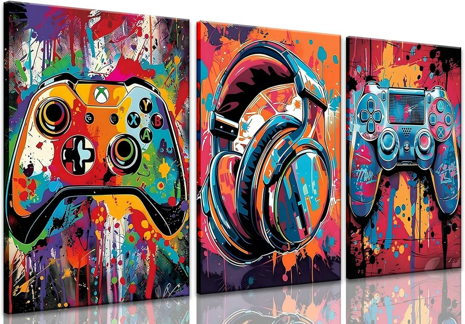 This set of gaming wall art features three bold posters that capture the energy of gaming culture through graffiti-inspired designs and vibrant gamepad imagery. Ideal for creating a dynamic gaming atmosphere, the prints offer a stylish and modern look, ideal for teen bedrooms, game rooms, or even living spaces.