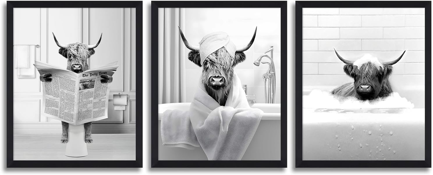Add a dash of humor to your decor with this playful highland cow print, perfect for bathrooms or other casual spaces. The black-and-white design pairs well with a variety of styles, and the durable frame and fade-resistant print ensure it holds up over time. It's an excellent choice for both decorating and gift-giving on special occasions.