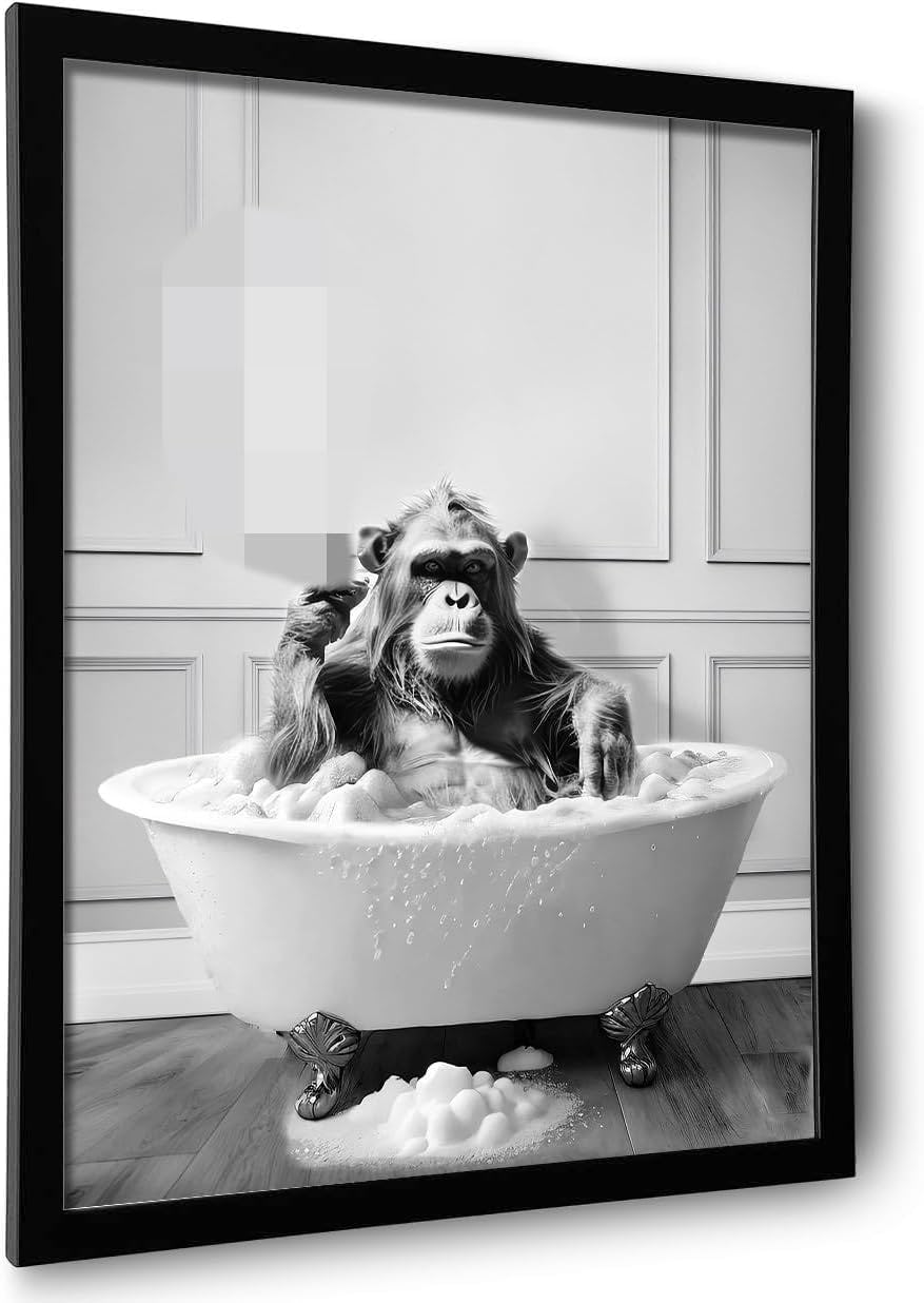 The framed chimpanzee wall art arrives ready to hang with a sleek black frame and metal hangers for straightforward installation. Printed on high-quality canvas with UV-resistant inks, it adds a humorous and sophisticated touch to small spaces like bathrooms or hallways, while the protective plexiglass ensures durability.