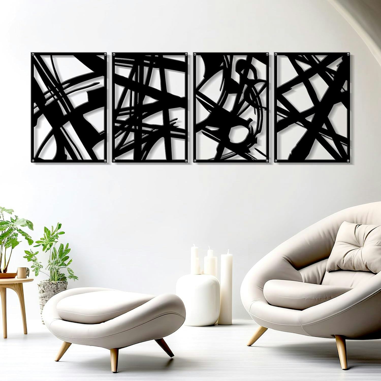 This set of four metal wall art pieces features abstract lines and a hollow 3D design, adding a modern and artistic touch to your room. Made from durable, high-quality metal with a black powder-coated finish, these decorations are both waterproof and fade-resistant, ensuring long-lasting elegance.