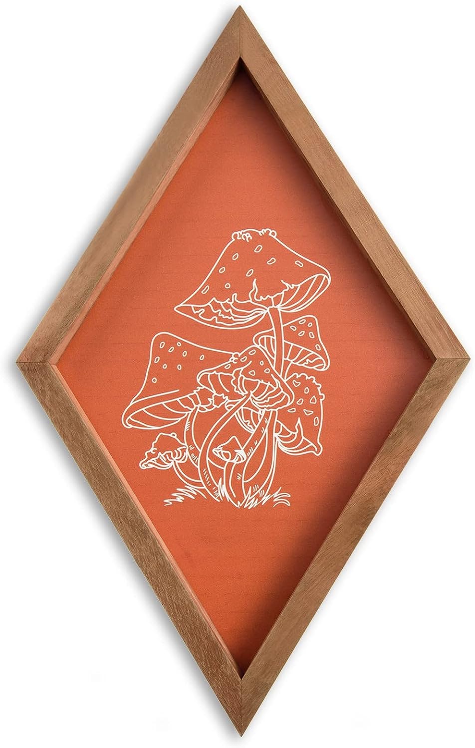 This diamond-shaped mushroom wall art showcases a unique design printed on an orange wood board, combining rustic farmhouse style with a playful aesthetic. Handcrafted from high-quality wood, it is carefully sanded and stained for a vintage, distressed finish that enhances its visual appeal. The natural wood texture and intricate mushroom print make it a standout piece in any room.