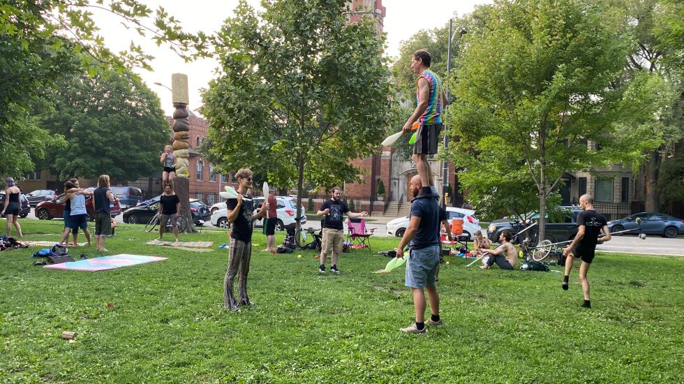 Others, like Bearden, bring their kids along. Though Bearden and his daughter now live in California, they make it a priority to attend the Palmer Square flow jam when they’re in town. For him, it’s unique to find a group that has fostered a sense of community without any feelings of competition. It’s why he loves bringing Anara around whenever he can, and the two often learn tricks together with help from other artists.