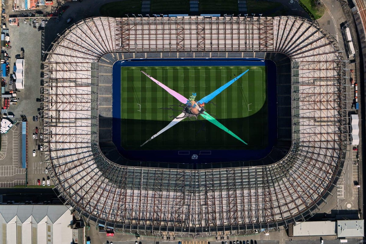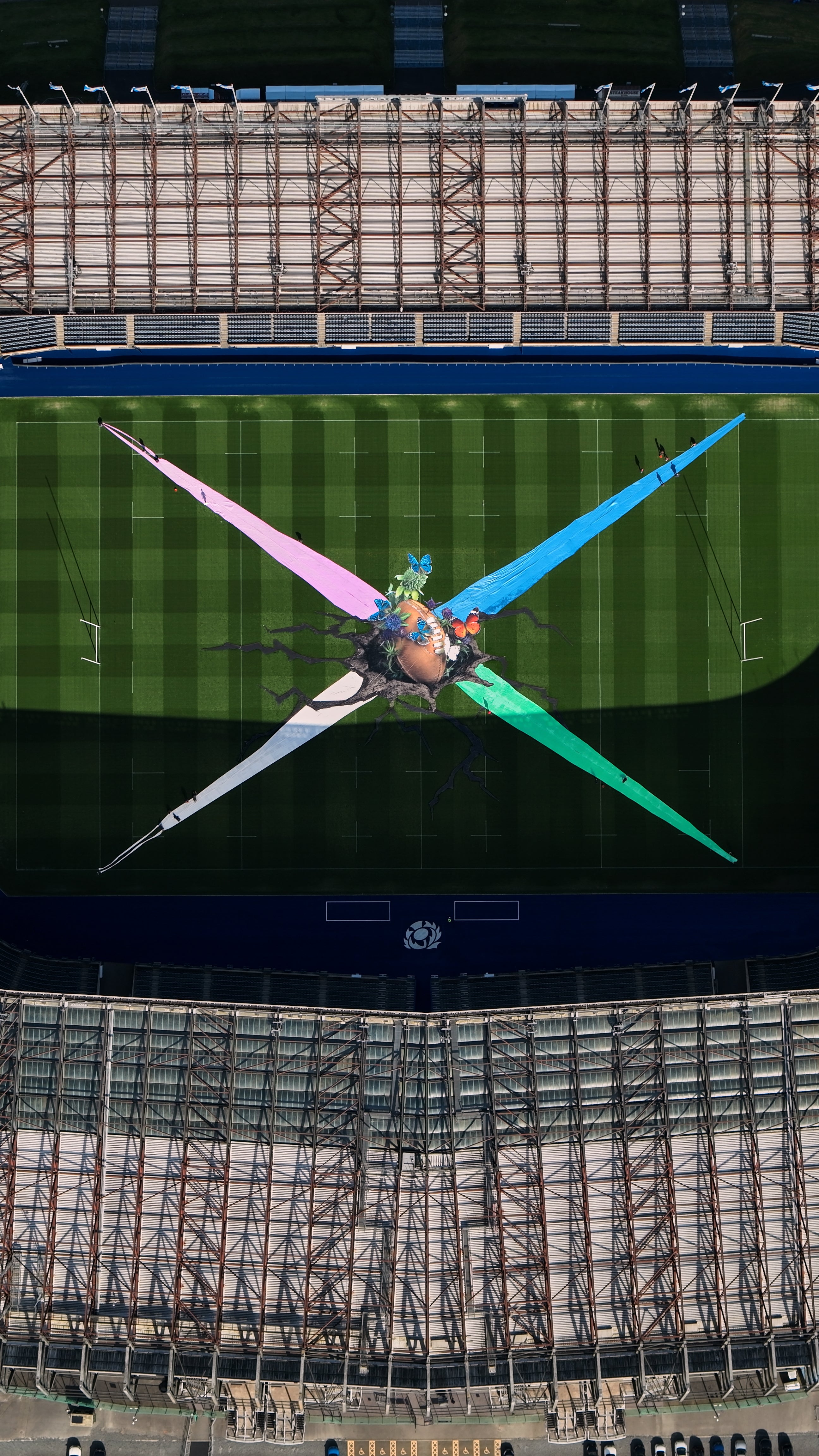 The artwork is made of banner material and is designed to be an optical illusion visible from the sky, depicting a rugby ball embedded in the pitch.