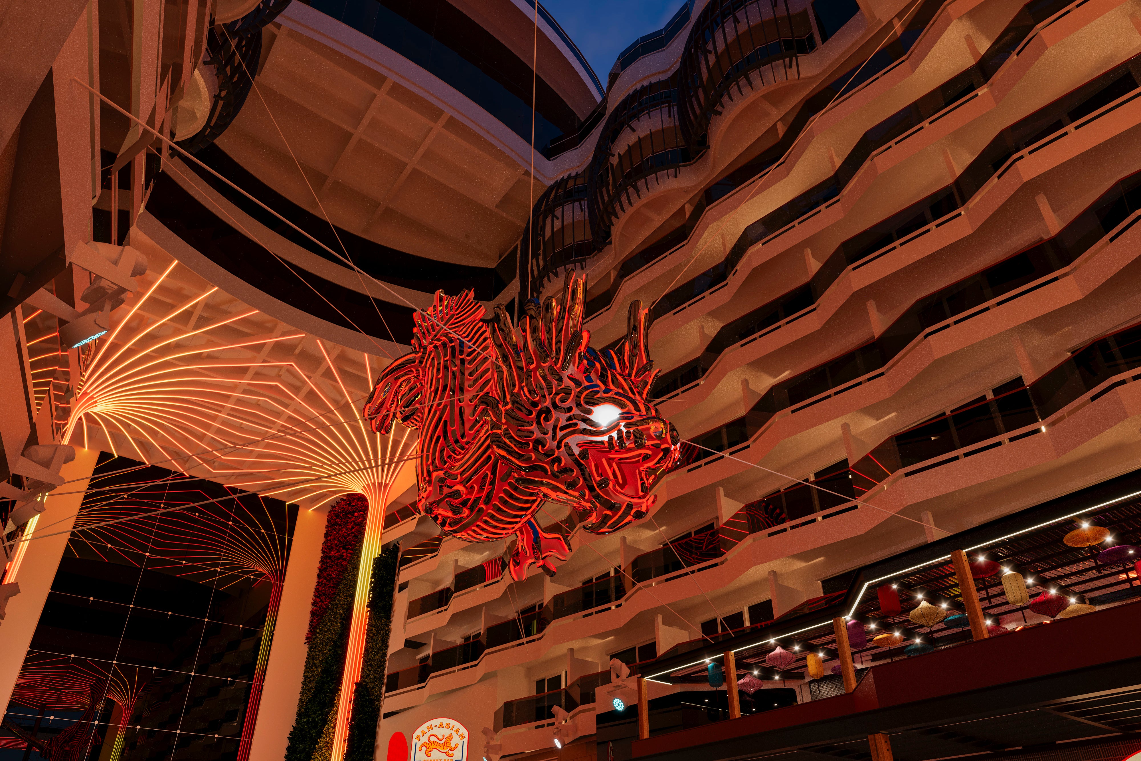 A stainless steel dragon suspended from the ceiling 10 metres above the World Promenade will welcome guests as they explore the area’s restaurants and bars.