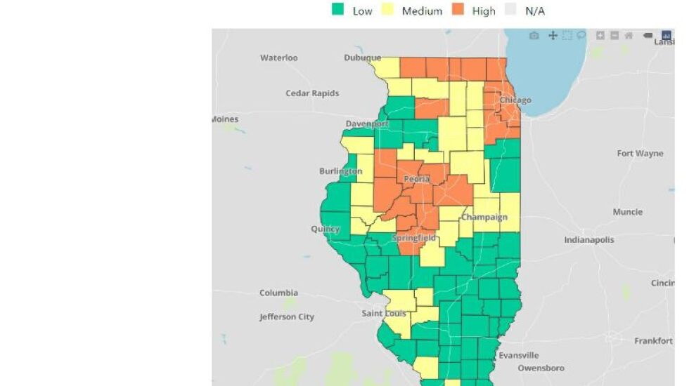 On Friday, four more Illinois counties were added to the orange “high” risk level in the Center for Disease Control and Prevention’s color-coded rating system, bringing the state’s total to 19 “orange” counties — including most of the Chicago area. Another 31 counties are at the yellow “medium” risk level.