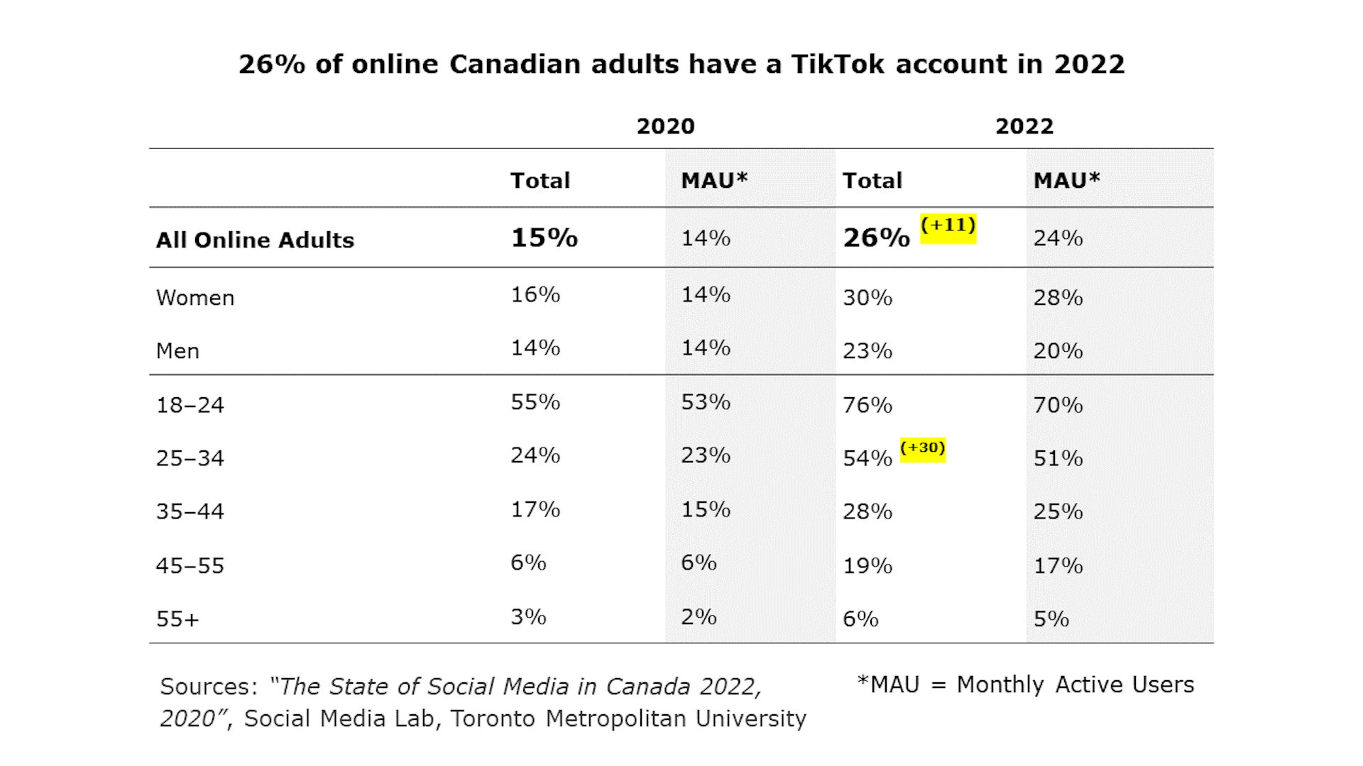 We found that TikTok had the largest gain (an increase of 11 per cent) in the number of Canadian adults who reported having an account on the platform in 2022, compared to data we collected in 2020.