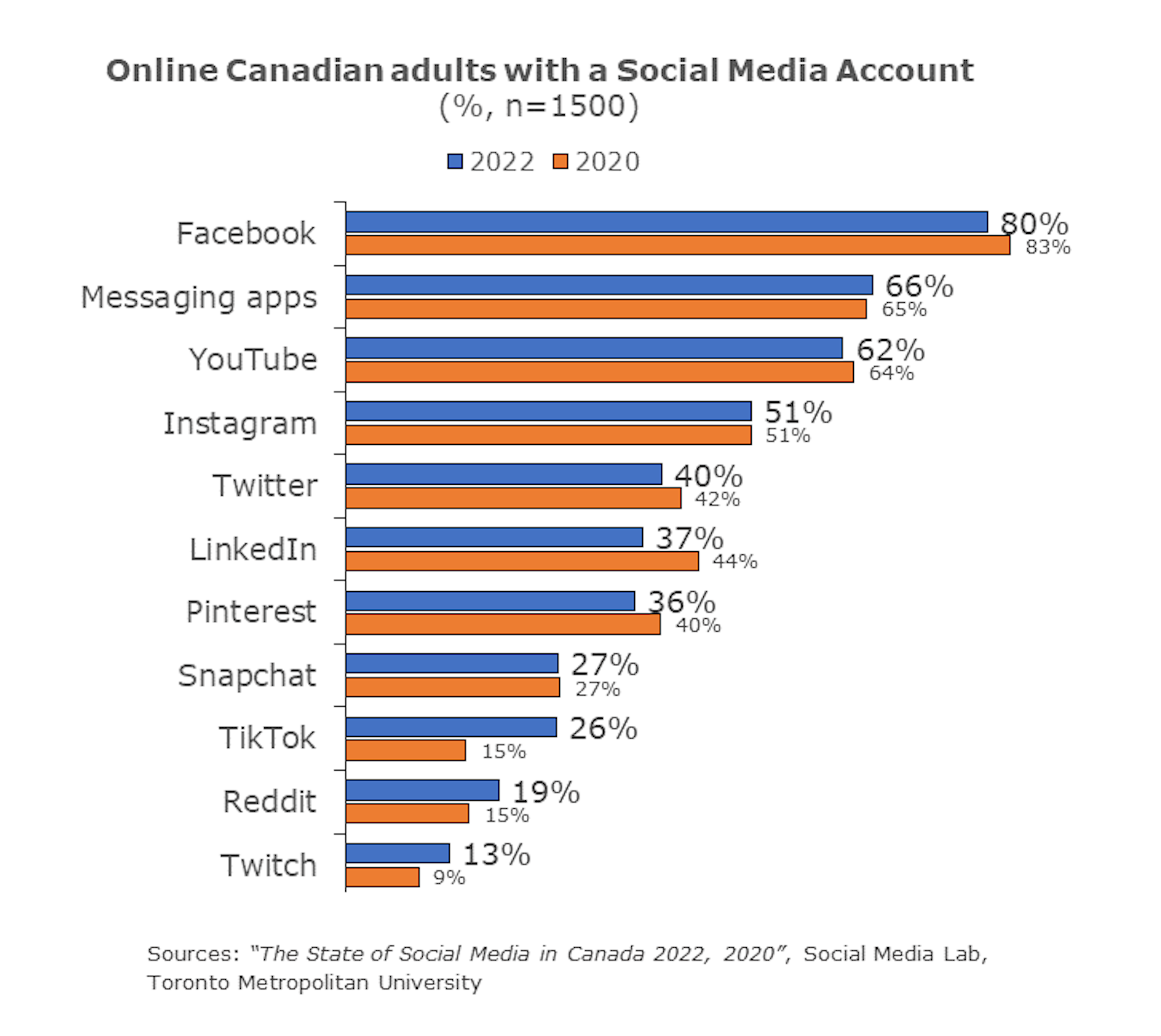 Fewer Canadians reported having an account on popular social media platforms such as Facebook, LinkedIn and Pinterest. Platforms such as Facebook, messaging apps and YouTube still dominate in terms of the number of users, but newer platforms — like TikTok — and more niche platforms — like the livestreaming service Twitch — are gaining ground.
