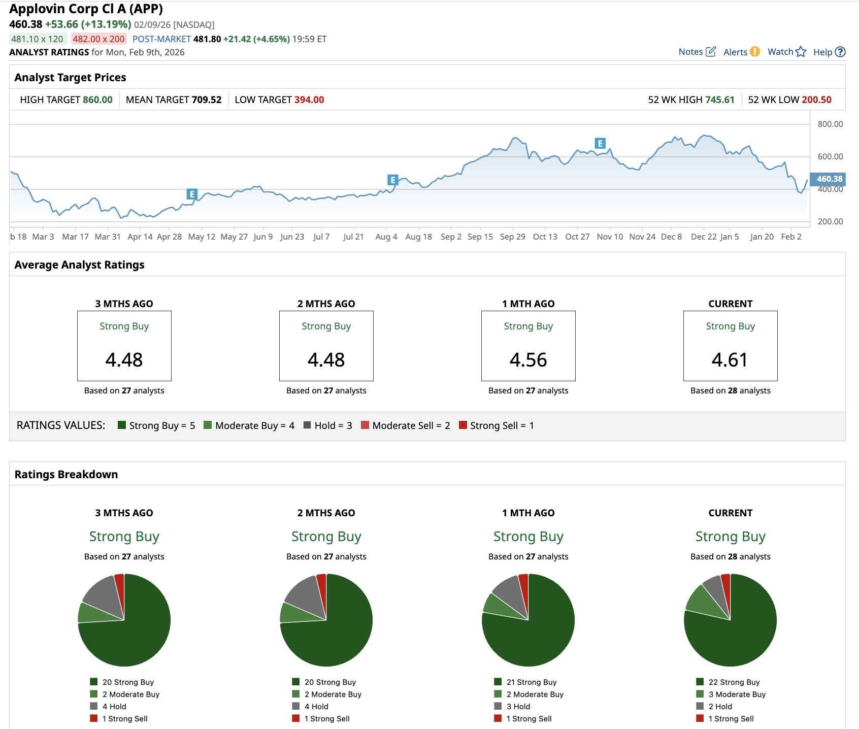 Overall, AppLovin has a “Strong Buy” consensus rating. Out of the 28 analysts covering APP stock, 22 recommend a “Strong Buy” rating, three recommend a “Moderate Buy,” two recommend a “Hold,” and one recommends a “Strong Sell” rating. The average AppLovin stock price target is $709.52, which represents 54% potential upside from current levels.