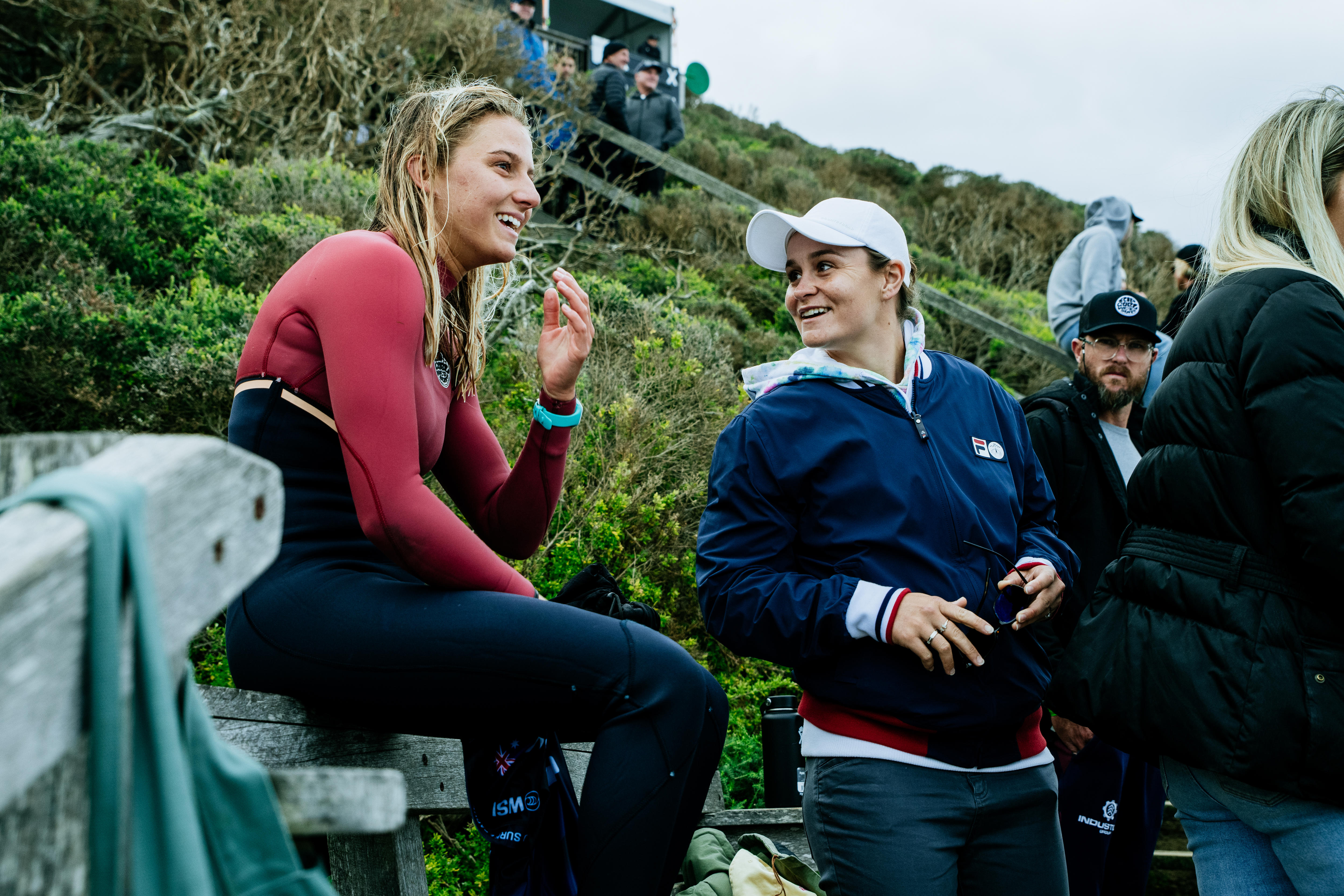 Retired tennis star Ash Barty has made a surprise appearance at Bells Beach to see a group of Australian surfers keep their Rip Curl Pro hopes alive.