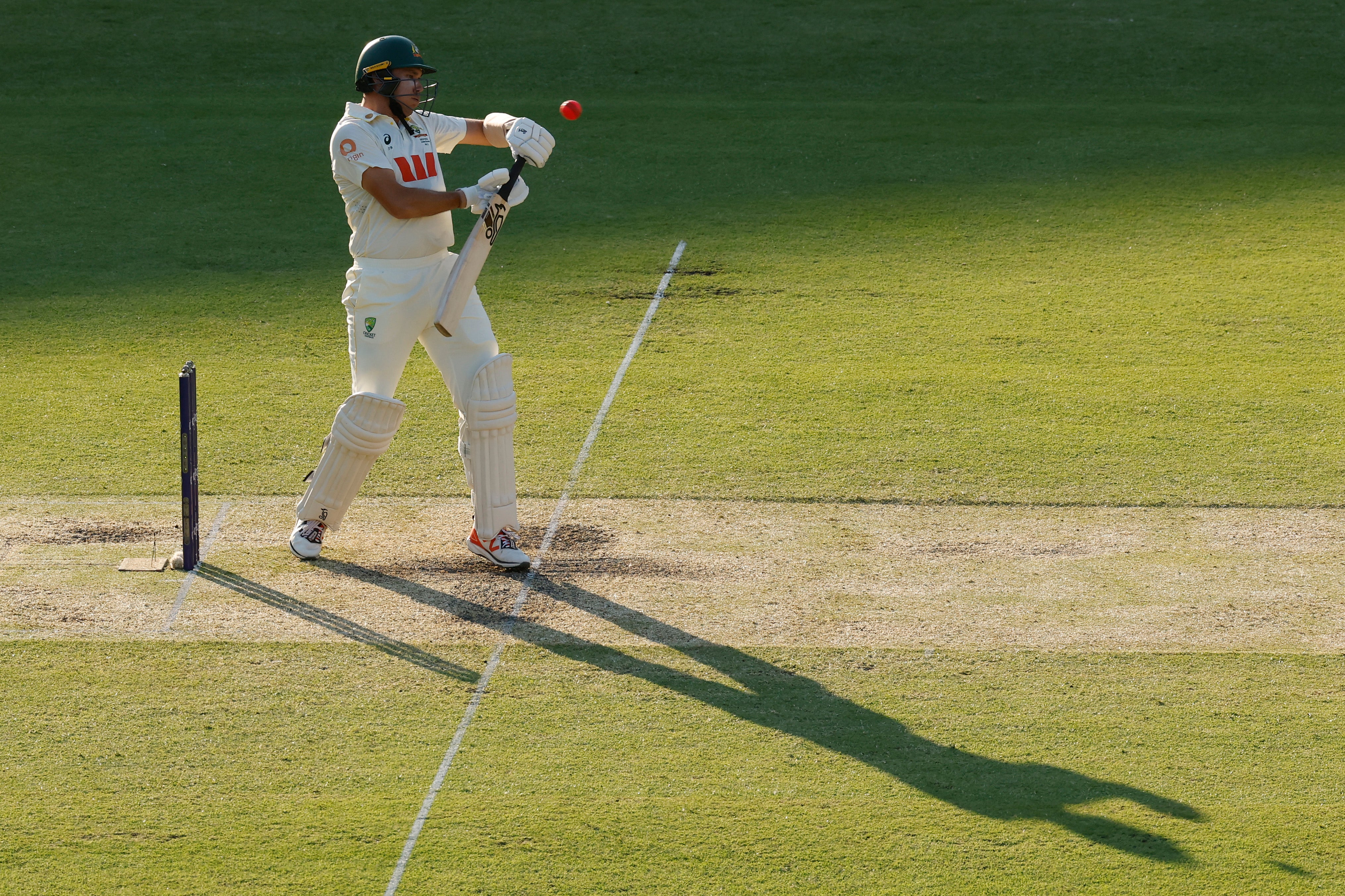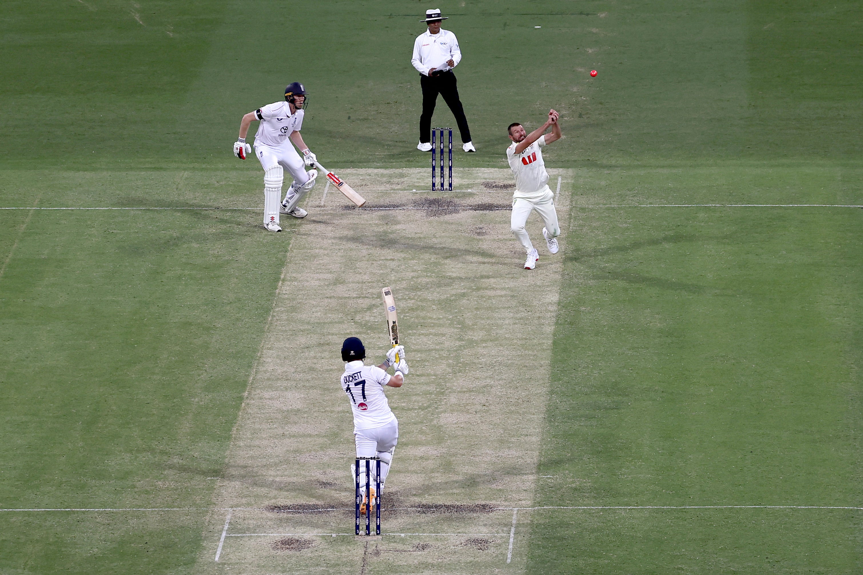 07:55 , Harry Latham-CoyleEdged...but short! Would you believe it? Brendan Doggett prods outside off stump, Will Jacks’s ball goes on with the arm and kisses the edge, but doesn’t reach Harry Brook lunging desperately forward at slip. Onwards Australia go.