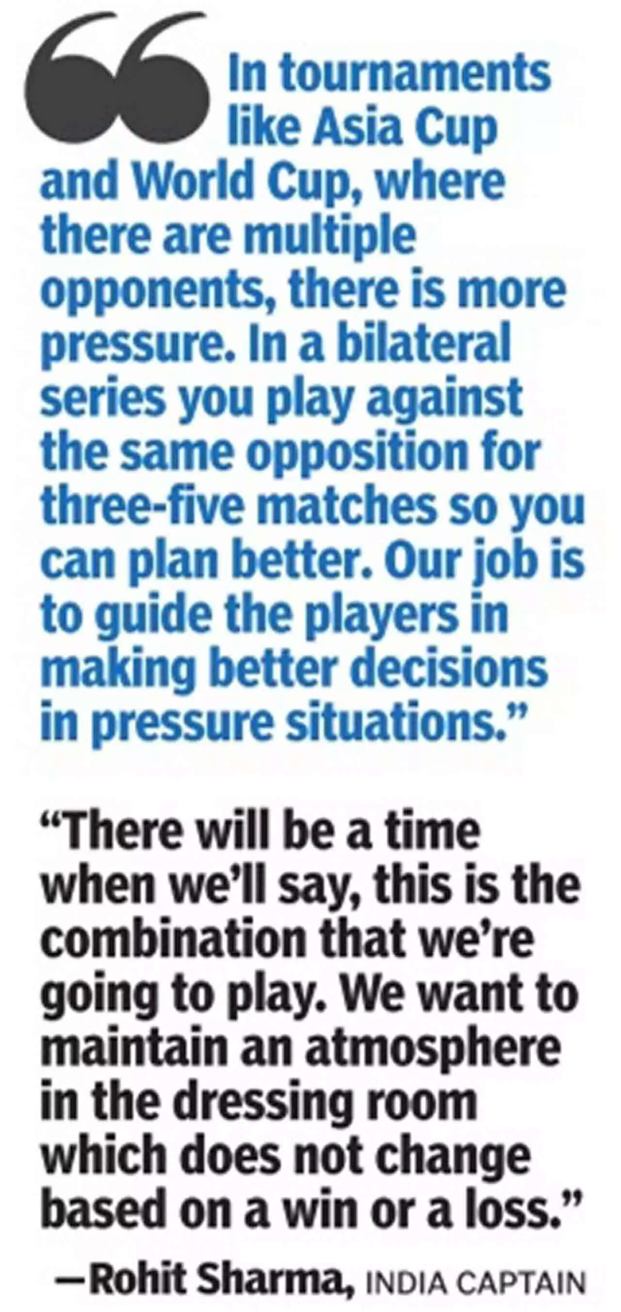 "There will be a time when we will draw a line and say, 'this is the combination we want to play for the World Cup.' After this, we have two more series and then the World Cup. Till our squad is announced, we can try out a few players," Rohit said, staying firm on his strategy after back-to-back defeats to Pakistan and Lanka. The team management had identified players and assigned series to them in February itself. It was a conservative approach given the sheer volume of cricket the Indian players were scheduled to play throughout the year.