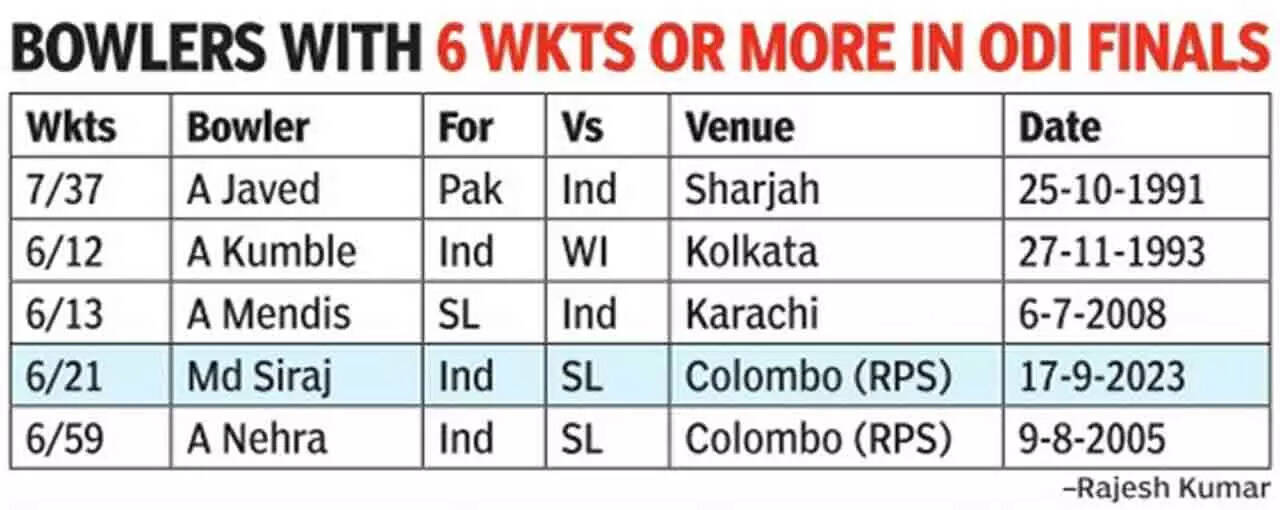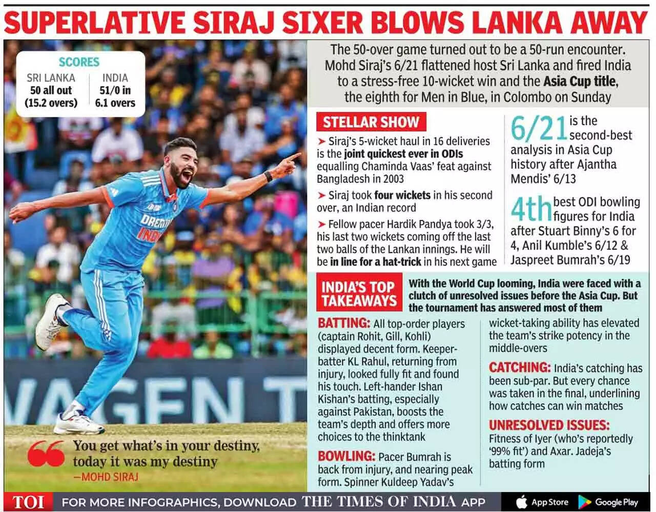All through the Asia Cup, Mohammad Siraj ran hard, beat batters repeatedly and saw no edges and hence minimal rewards. God probably had better things in store for him. So, the Asia Cup final vs Sri Lanka it was, where he was chosen to dazzle. And how. By producing just the fourth instance of a bowler taking four wickets in an over and the first by an Indian. He added two more to his tally to finish with 6-21.