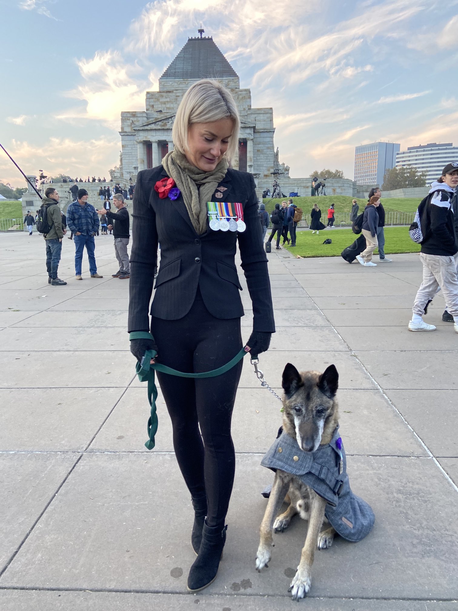 Jeep's partner in service, Lauren Marshall, stirred the ageing dog from warm blankets to make the journey into Melbourne's Shrine of Remembrance for the first full-scale service since COVID began.