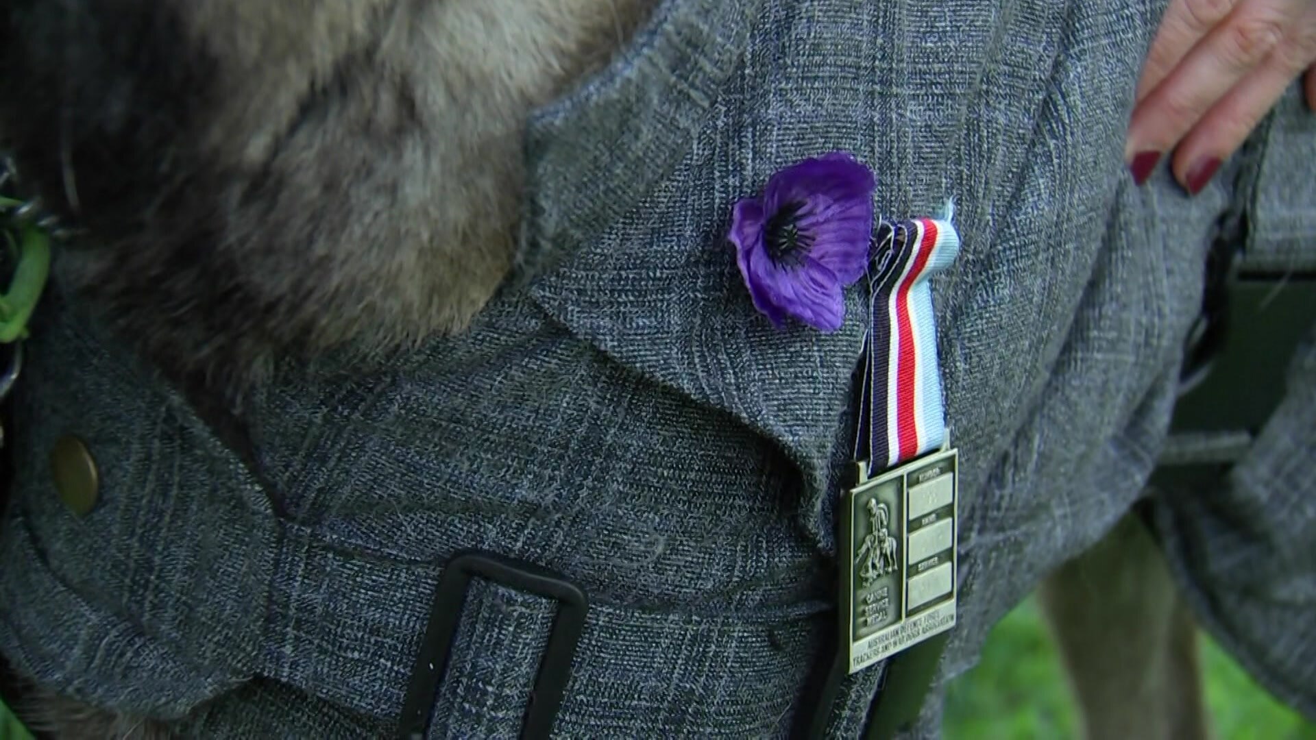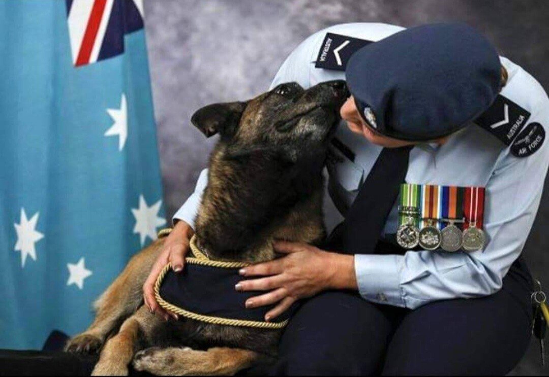 Before leaving, she pinned onto Jeep's coat a medal the dog earned for years of service in the Royal Australian Air Force (RAAF), as well as a purple poppy to honour the many thousands of animals that have died in military service.