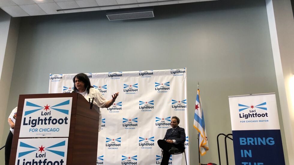 Perri Irmer, the president and CEO of the DuSable Black History Museum and Education Center, and the emcee of the rally, told the crowd that she and Lightfoot were students together at the University of Chicago Law School.