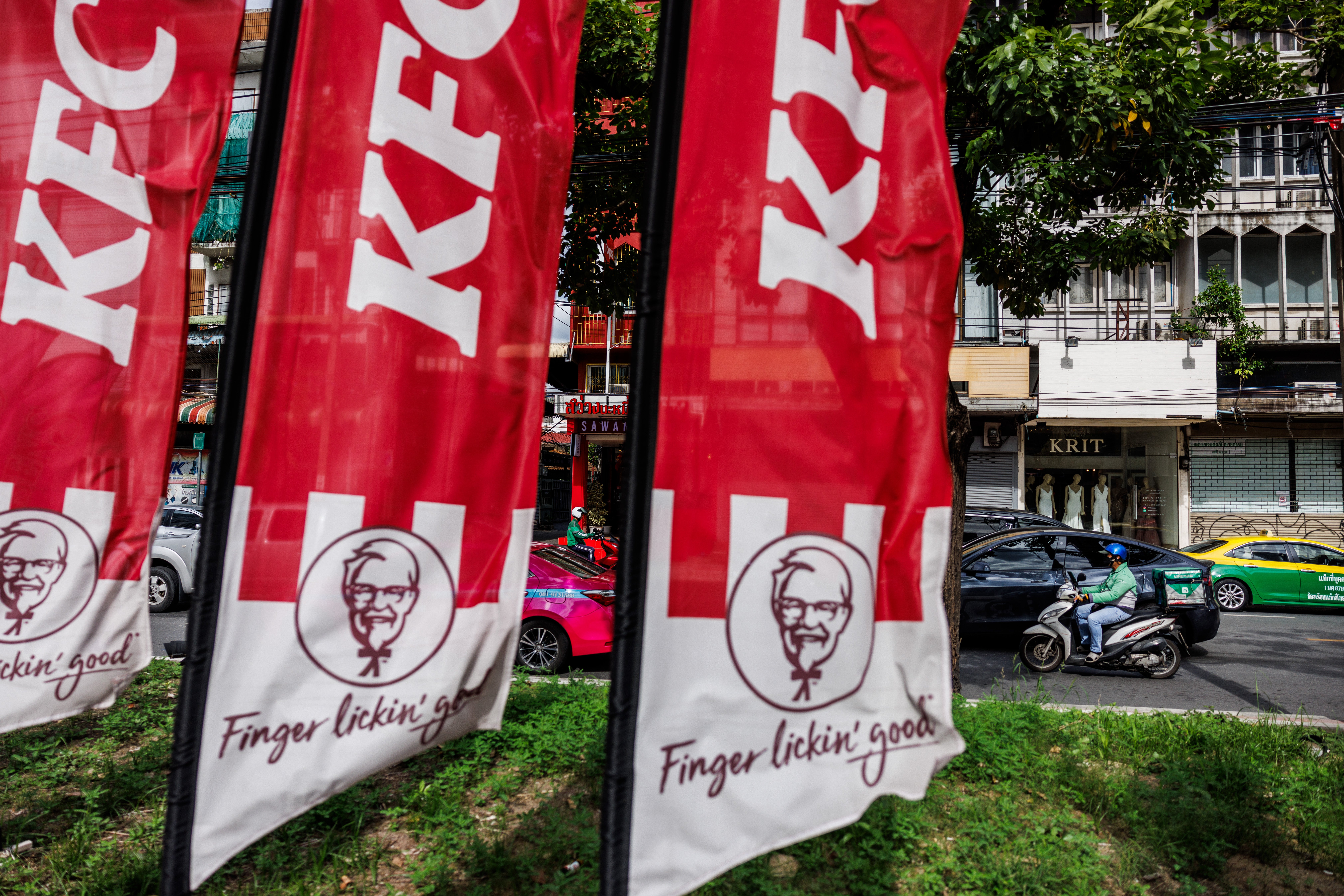 File. A motorbike drives past a KFC in Bangkok on 8 June 2024 (Getty)