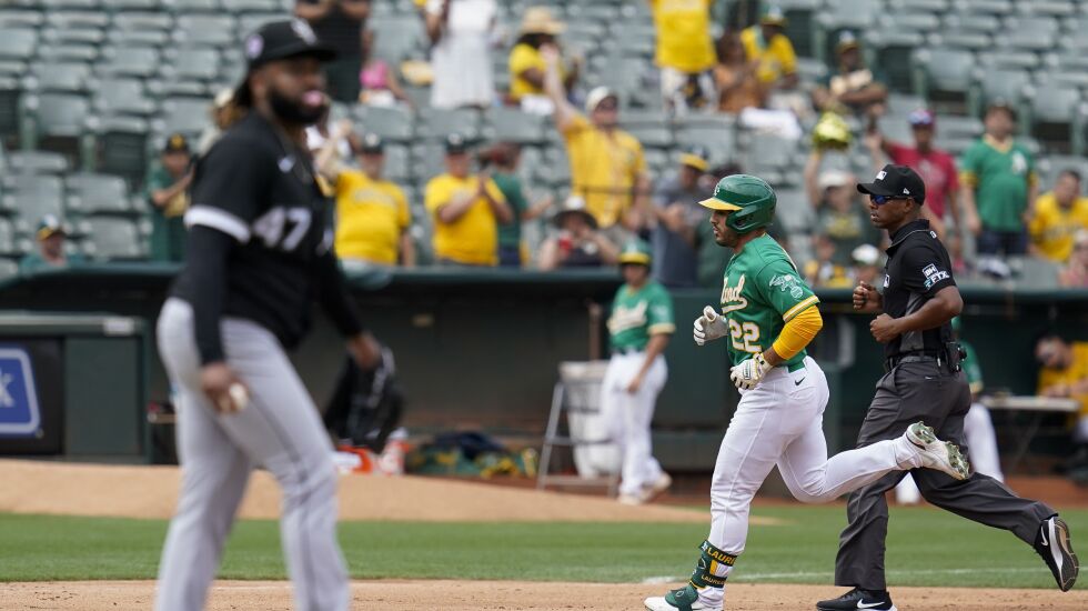 Not much went right Sunday, though, especially in a six-run A’s fifth. Vimael Machin doubled in two runs and Ramon Laureano got second life after third baseman Leury Garcia dropped a foul pop near the dugout and ended an 0-fo-18 skid with a two-run homer. Cuteo didn’t finish the inning, and allowed eight hits and five earned runs.