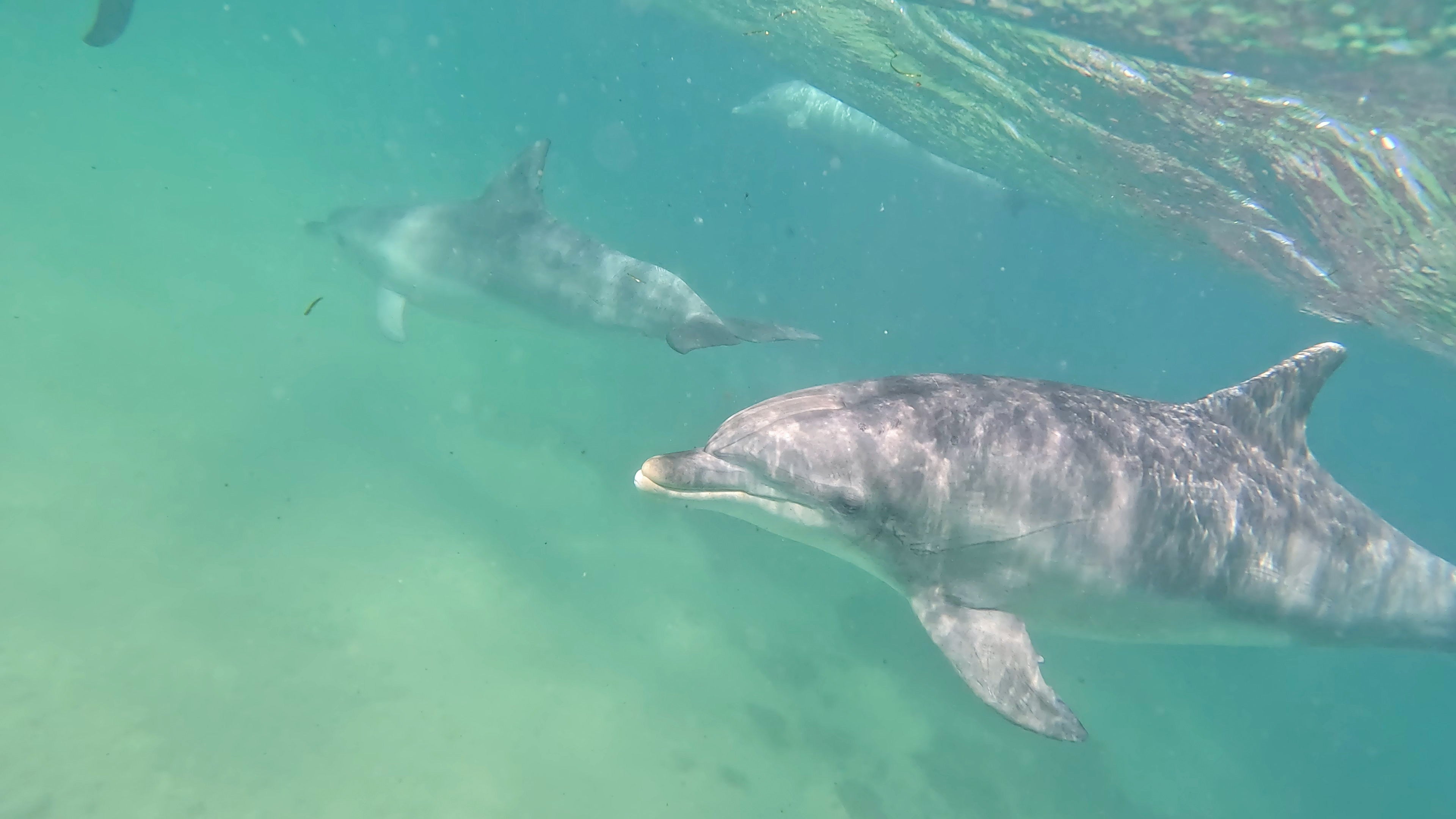 We’re sitting in a small boat, bobbing on the swell of the Southern Ocean, when we get the nod. Six of us in pull on our goggles and snorkels then step to the boat’s edge and down into the water, still chilly despite our 5mm wetsuits. The skipper points towards the edge of the bay and we see them – about half a dozen dolphin fins heading our way.