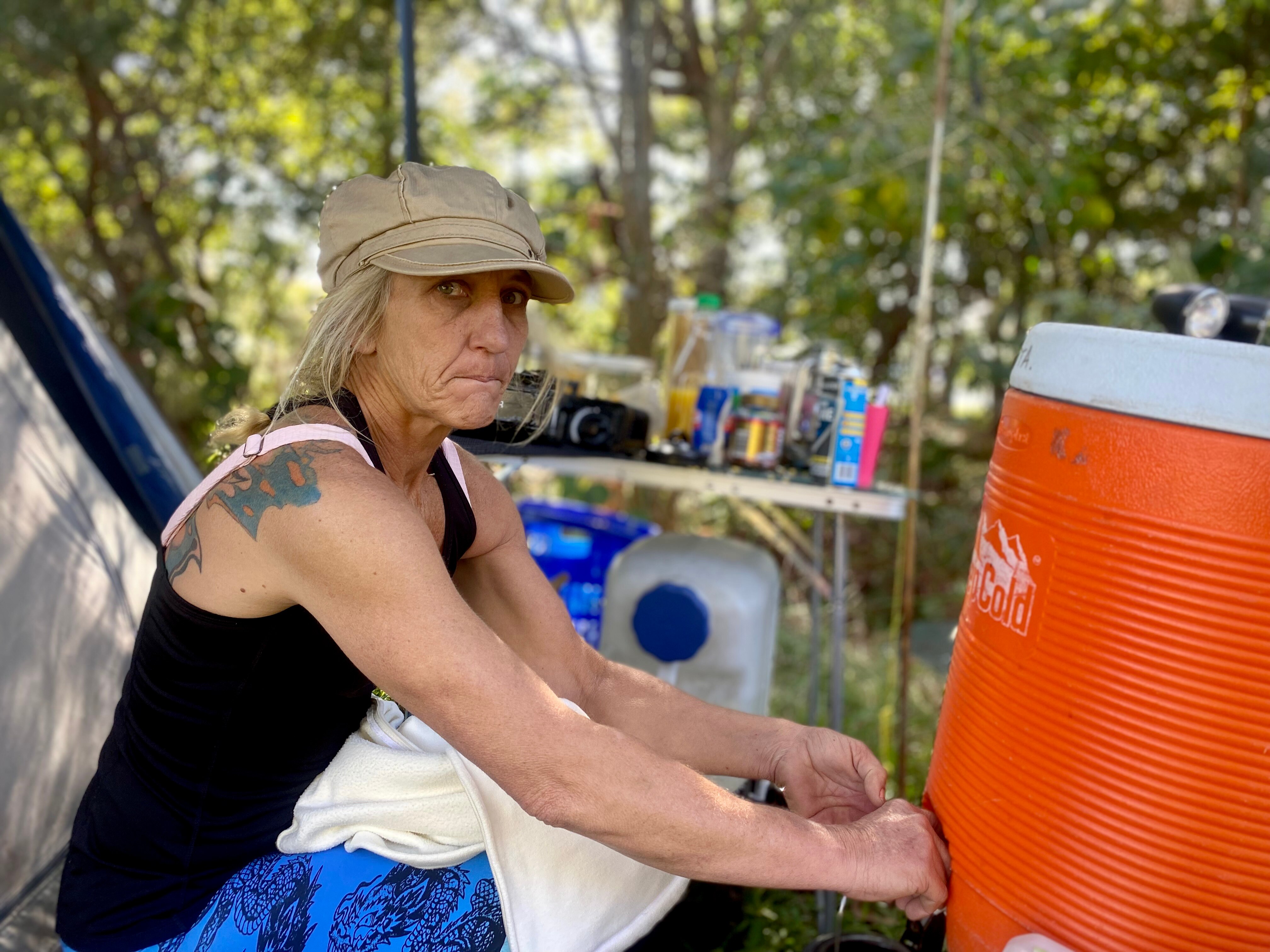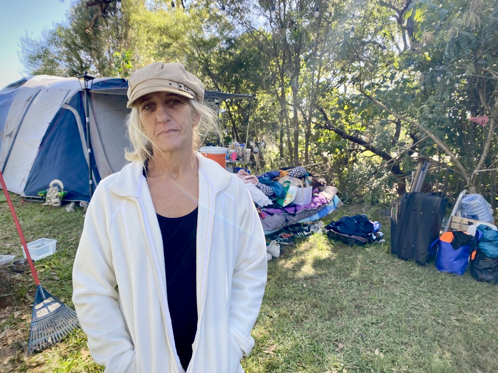 Her tent is hidden in bushland beside a Gold Coast highway, where thousands of cars pass each day.