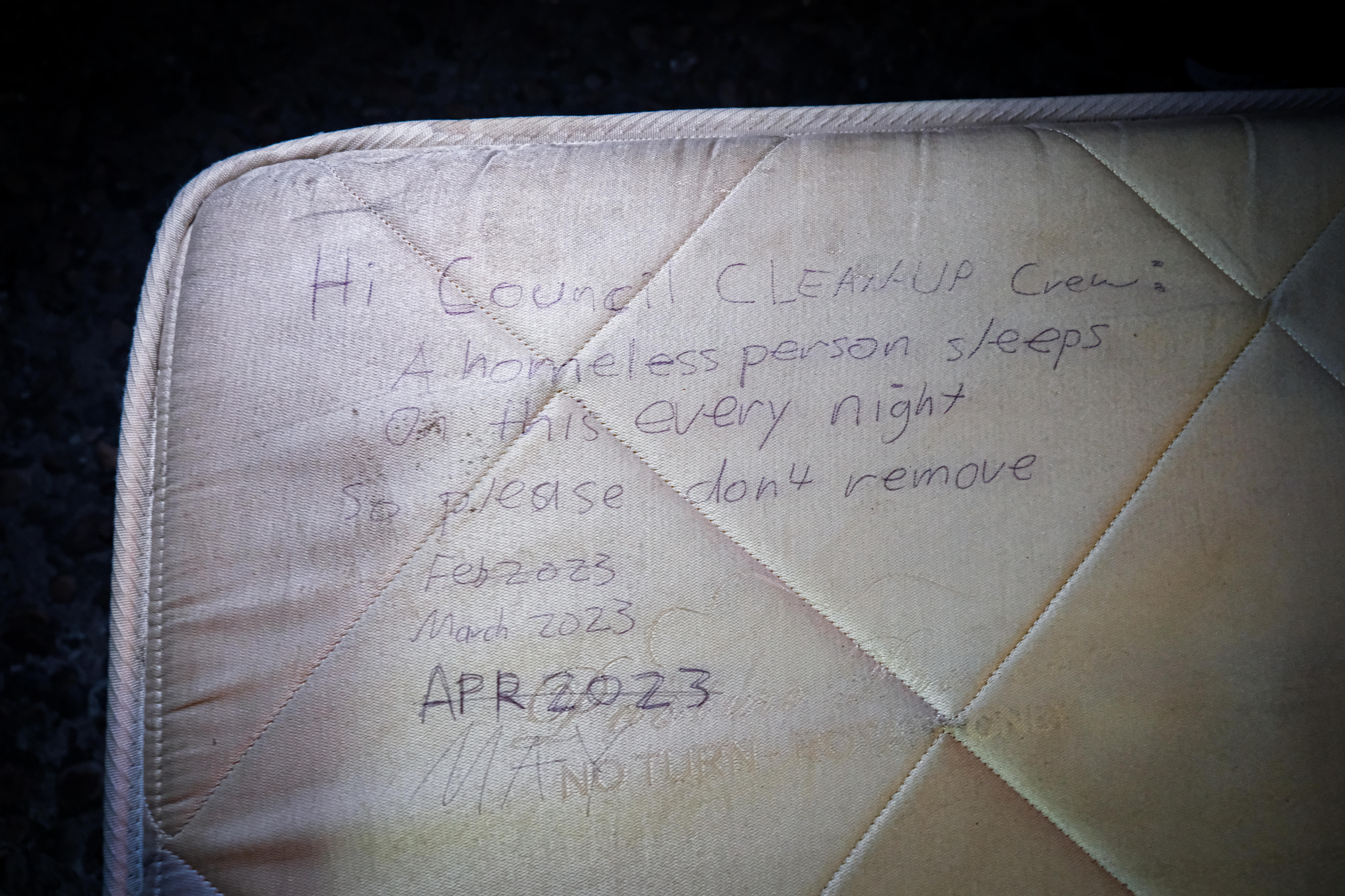 His mattress, propped each morning against a concrete pillar, had instructions written on it to stop council workers binning it.