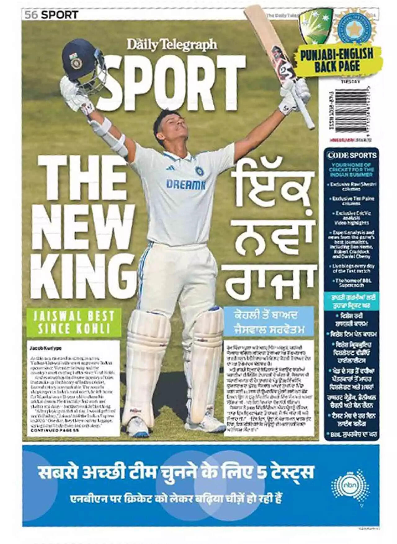 Not just that, the front page of the newspaper has a picture of Virat Kohli with a title in Hindi that translates to 'Fight for the ages' and has Jaiswal on the back page with the title in Punjabi that translates to 'The New King'.