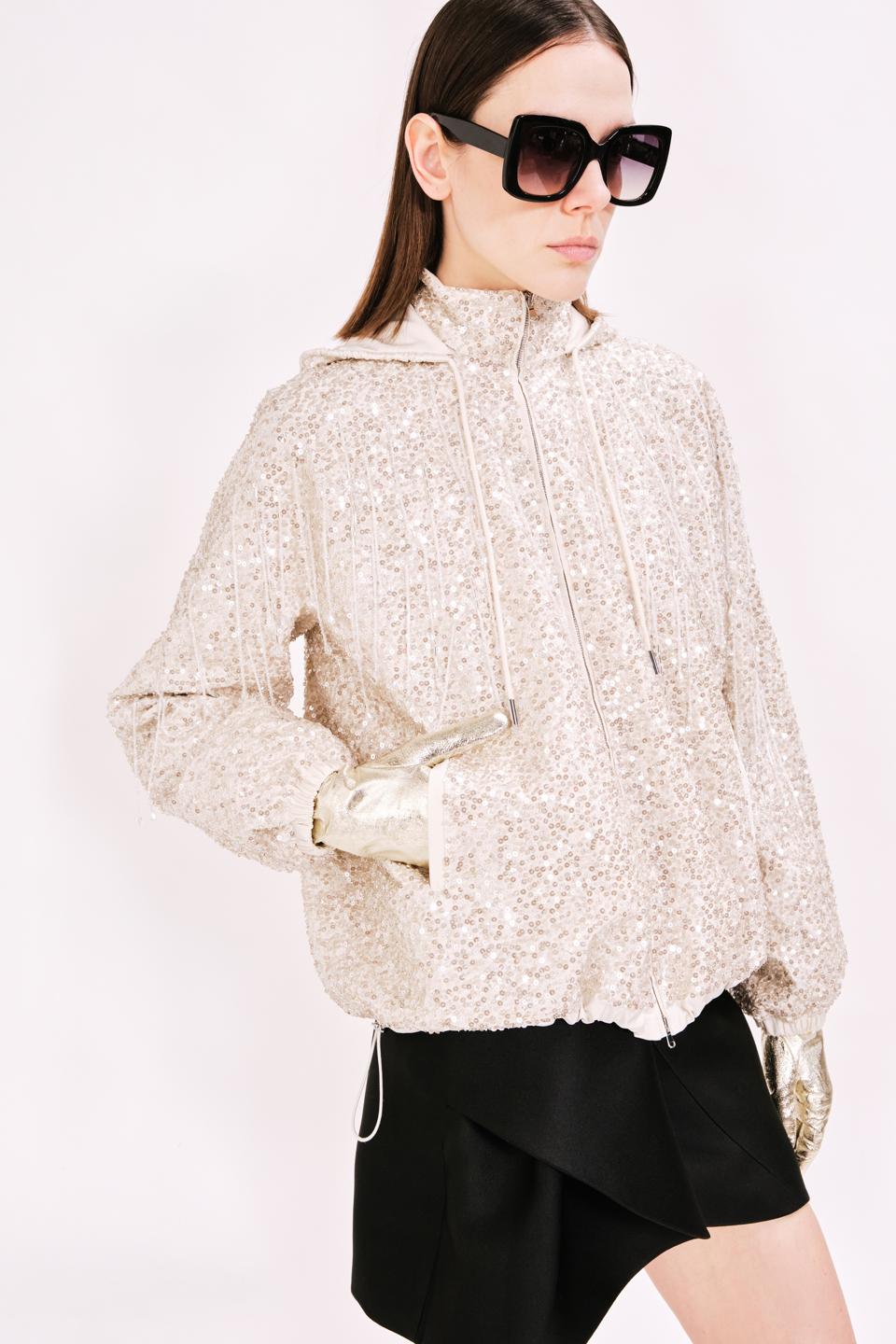 “We used a lot of technical-satins and silk metallic muslins and brocart and the formsa bombers, sweatshirts with hand-embroidery. You can wear them at night with a super short sequin skirt or tuxedo shorts. And the huge pants, I like very baggy pants, they look like they are long skirts but they’re actually pants,” shares Ece.