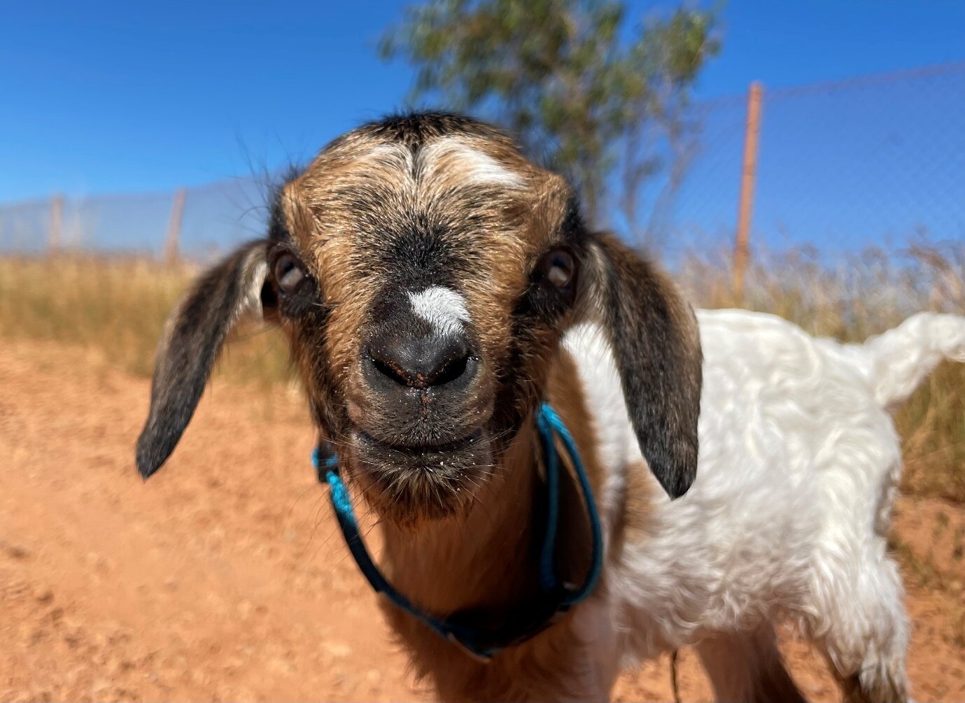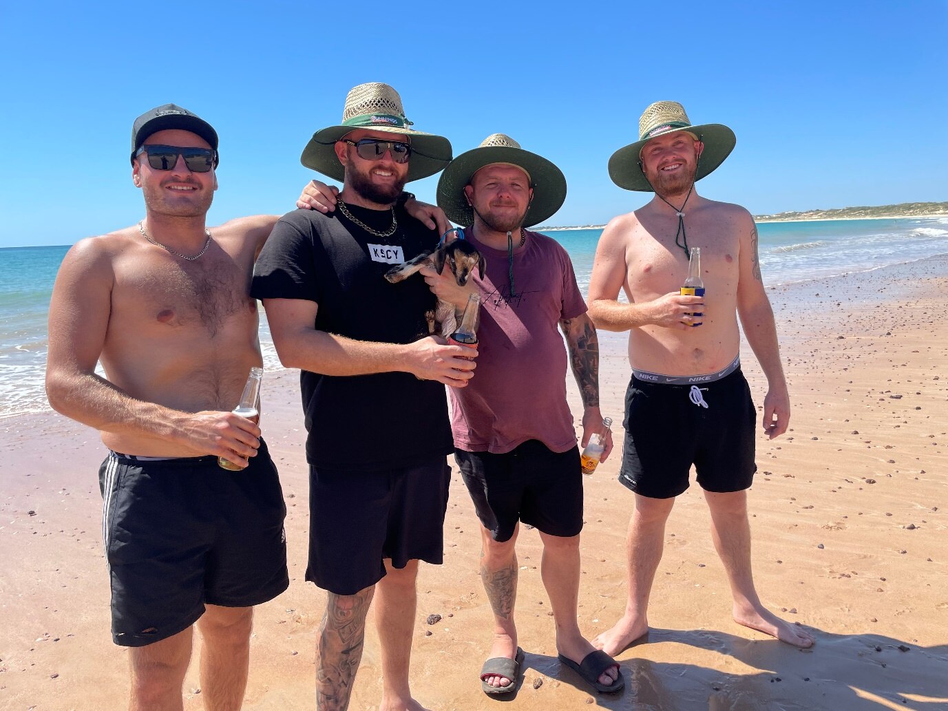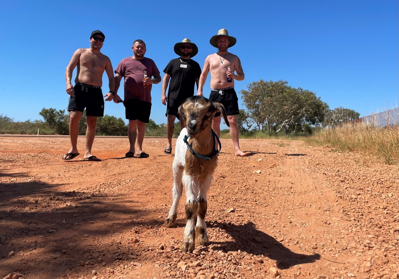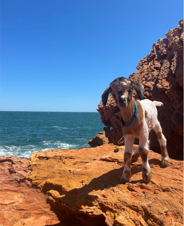 Doug the baby goat has been turning heads along the Great Northern Highway on his way to Broome this week with Mr Hornidge and friends Dillon Paulik, Luke Hornidge, and Mitchell Fitzpatrick.