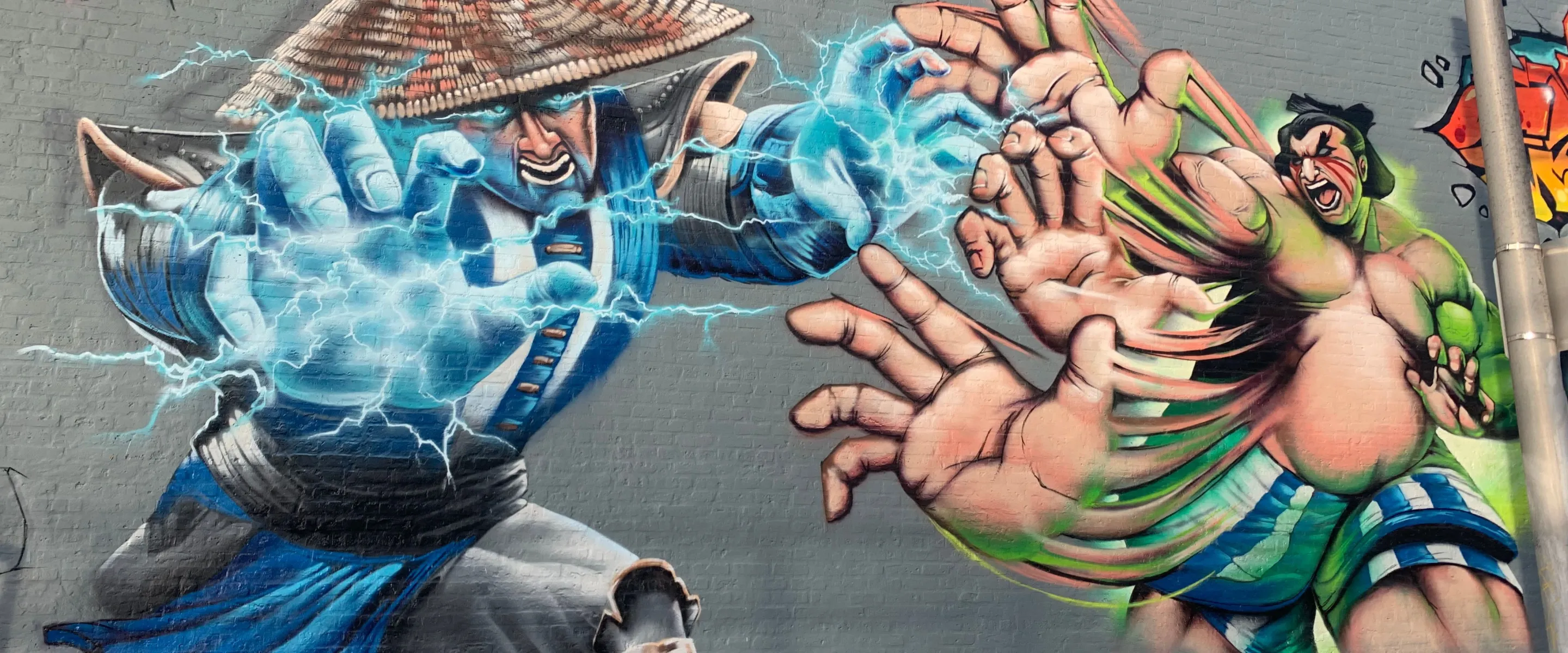 Coronado painted Sub-Zero from Mortal Kombat and Chun-Li from Street Fighter, placing them face to face, fists clenched, in a style he describes as a “realistic cartoon.”