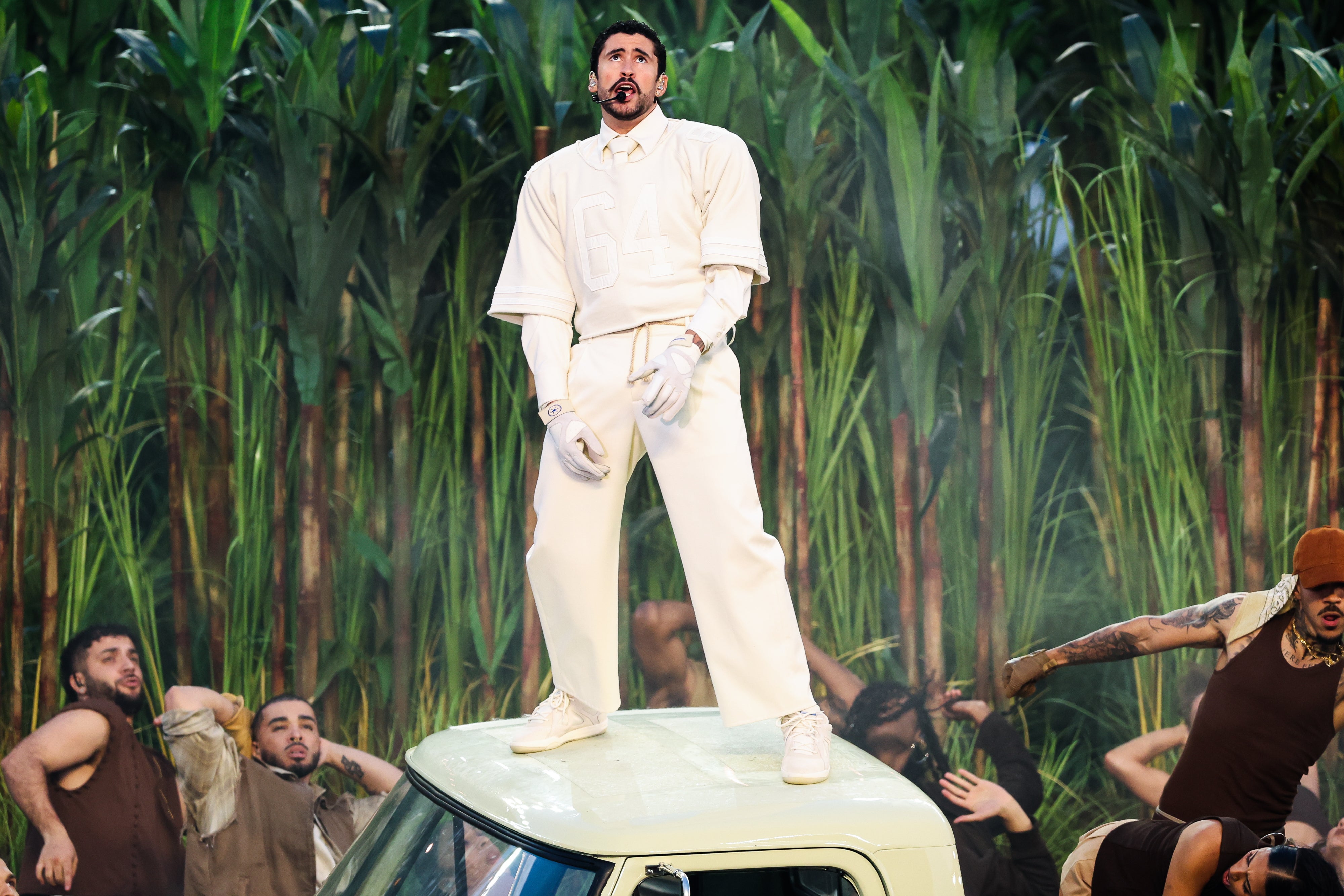 Bad Bunny wore an all-cream ensemble consisting of a collared shirt and tie, chinos and a sport-inspired jersey bearing the name “Ocasio” – his surname – and the number 64. The significance of the number was not confirmed, but fans were quick to speculate that it referenced his mother’s birth year.
