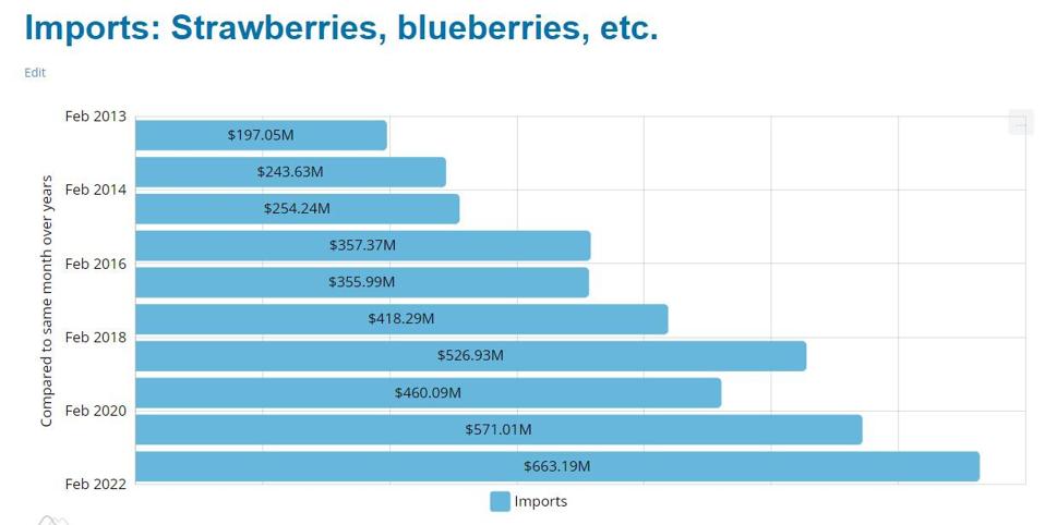 U.S. imports of strawberries, most of which come from Mexico, were at a record-setting pace in the month of February, the most recent U.S. government data shows. ustradenumbers.com