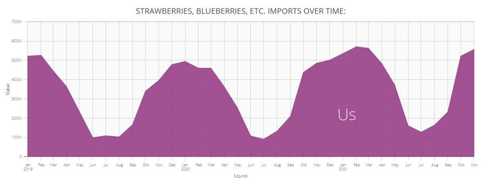 Berry imports are seasonal, with October through April being the strongest months, as this chart of 2019, 2020 and 2021 shows. The data is from the U.S. Census Bureau. ustradenumbers.com