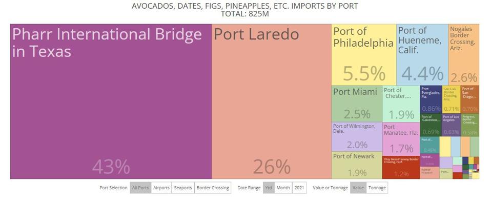 More than two-thirds of the value of all avocados and similar fruits that have entered the United States this year have entered at either Pharr or Port Laredo, according to Census data through February. ustradenumbers.com