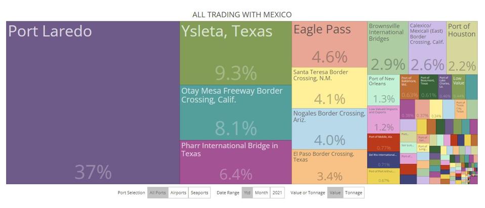 Port Laredo, the El Paso bridge at Ysleta, the Pharr International Bridge and Eagle Pass account for almost 54% of all U.S. trade with Mexico. ustradenumbers.com