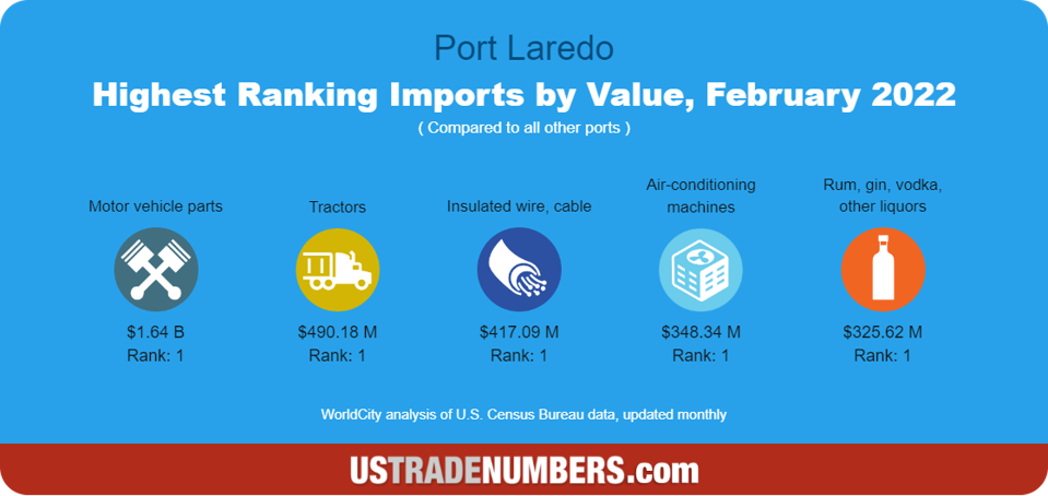 Port Laredo ranks No. 1 in the nation for hundreds of imports and exports. Here are the five most valuable imports where it ranked on top in February, according to the latest U.S. Census Bureau data. ustradenumbers.com