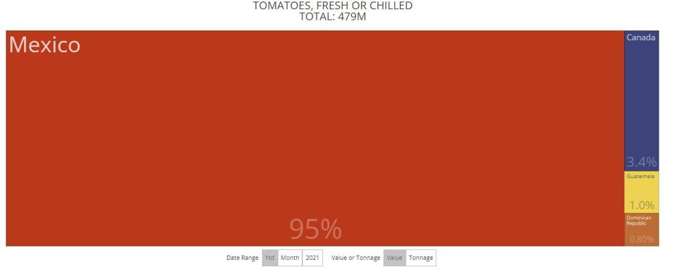 Mexico is accounting for 95% of all U.S. tomato imports this year. That is one of many fruit and vegetable imports that cross the Pharr International Bridge, where a truckers' blockade stopped traffic on the bridge on Monday. ustradenumbers.com