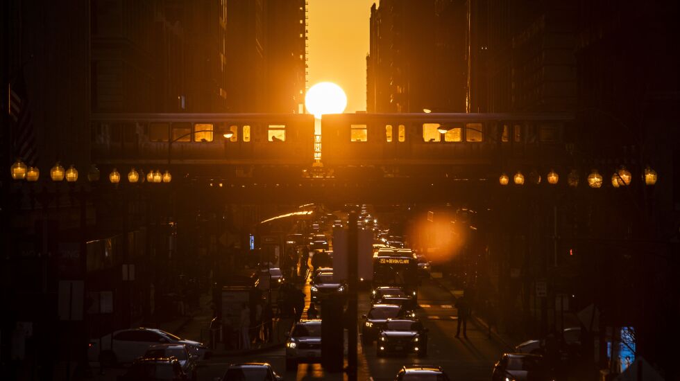 Every year around the fall and spring equinoxes, many Chicagoans stop and stand in the middle of downtown streets for the perfect photo: the sun shining directly through the Loop’s grid, illuminating the buildings in a fierce orange.