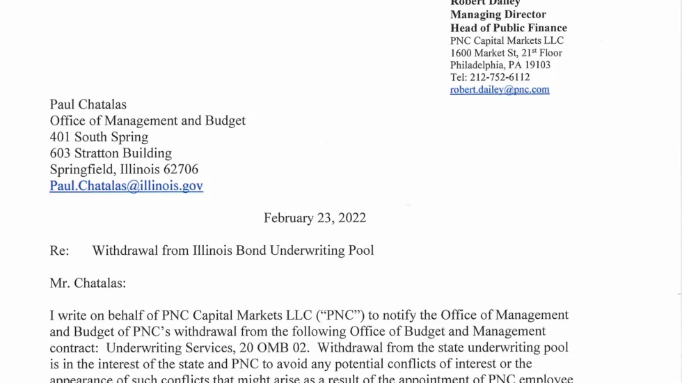“The first conversation with PNC regarding conflicts took place on Jan. 19, 2022,” according to Abudayyeh. “PNC withdrew from the Illinois State Toll Highway Authority’s bond underwriting pool on Feb. 23, 2022. . . . Out of an abundance of caution, the Governor’s Office of Management and Budget will no longer be using PNC going forward for work in capital markets.”