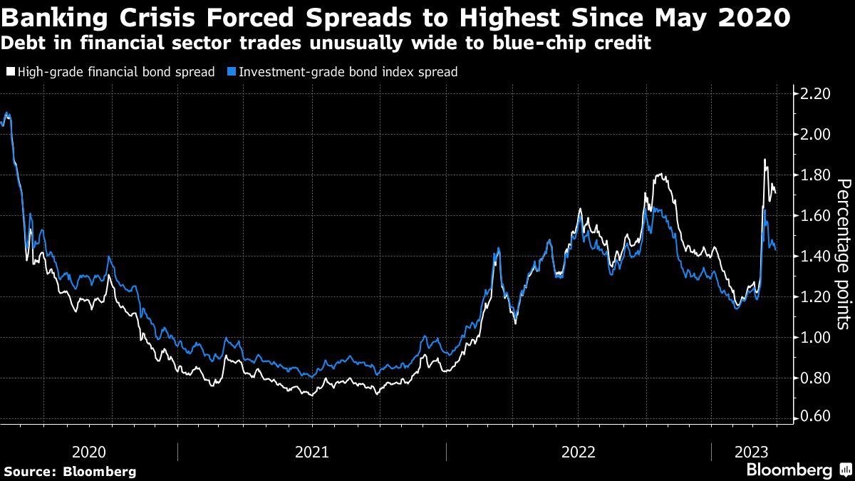 “It’s not a stretch to describe the current market as a once-in-a-decade buying opportunity for bank paper, especially the high-quality regional and custody banks that have blown out amid the panic,” wrote Jesse Rosenthal and Peter Simon, strategists at research firm CreditSights Inc. “This is as cheap as bank spreads get outside of a global financial crisis,” they wrote in a March 23 note.