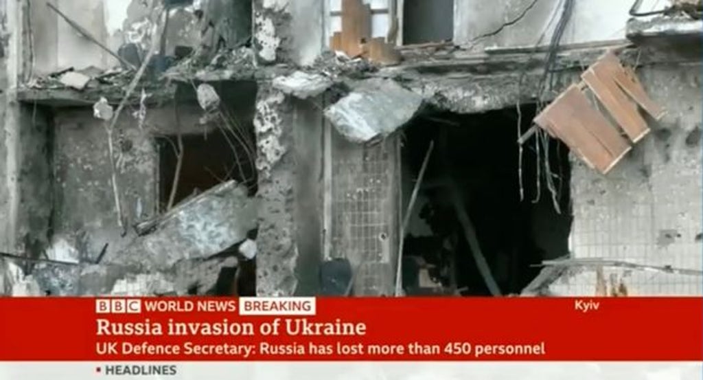 In a BBC News bulletin on Friday, Olga Malchevska reported on the latest developments in the war, with her colleague Karin Giannione, a BBC World presenter, as fighting broke out near to the city centre.