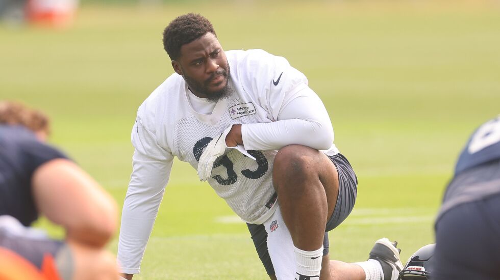 The starting offensive line was as expected: left tackle Braxton Jones, left guard Teven Jenkins, center Cody Whitehair, right guard Nate Davis and right tackle Darnell Wright. Larry Borom appears to be the swing tackle, and the Bears need to find at least two backup interior linemen out of Lucas Patrick, Alex Leatherwood, Ja’Tyre Carter, Doug Kramer and a few others in camp.