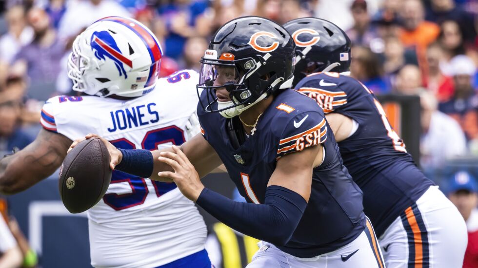 Fields played the first quarter plus one snap. He left after the first play of the second quarter, a third-and-10 screen pass to running back D’Onta Foreman. Fields was knocked down by Bills defensive tackle Ed Oliver on the play, went to the sideline and was replaced by rookie Tyson Bagent. Fields did not seem injured; he wasn’t treated by anyone on the Bears’ medical staff.